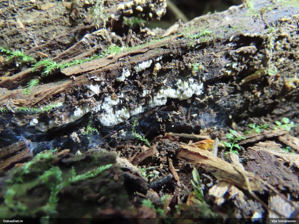 Satrūdējusi kritala mežā, nav dēļi. Iespējams, egle, jauktu koku mežs.