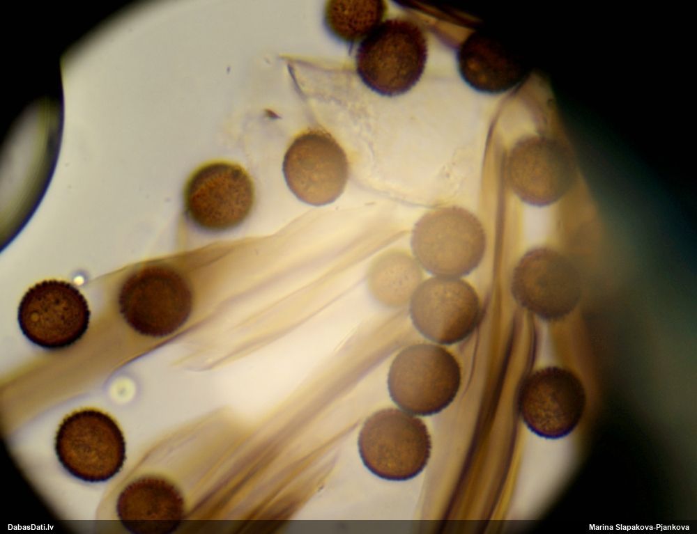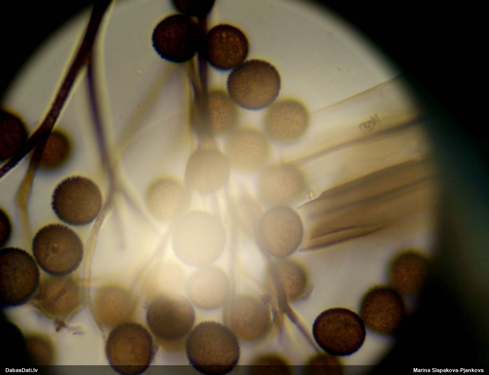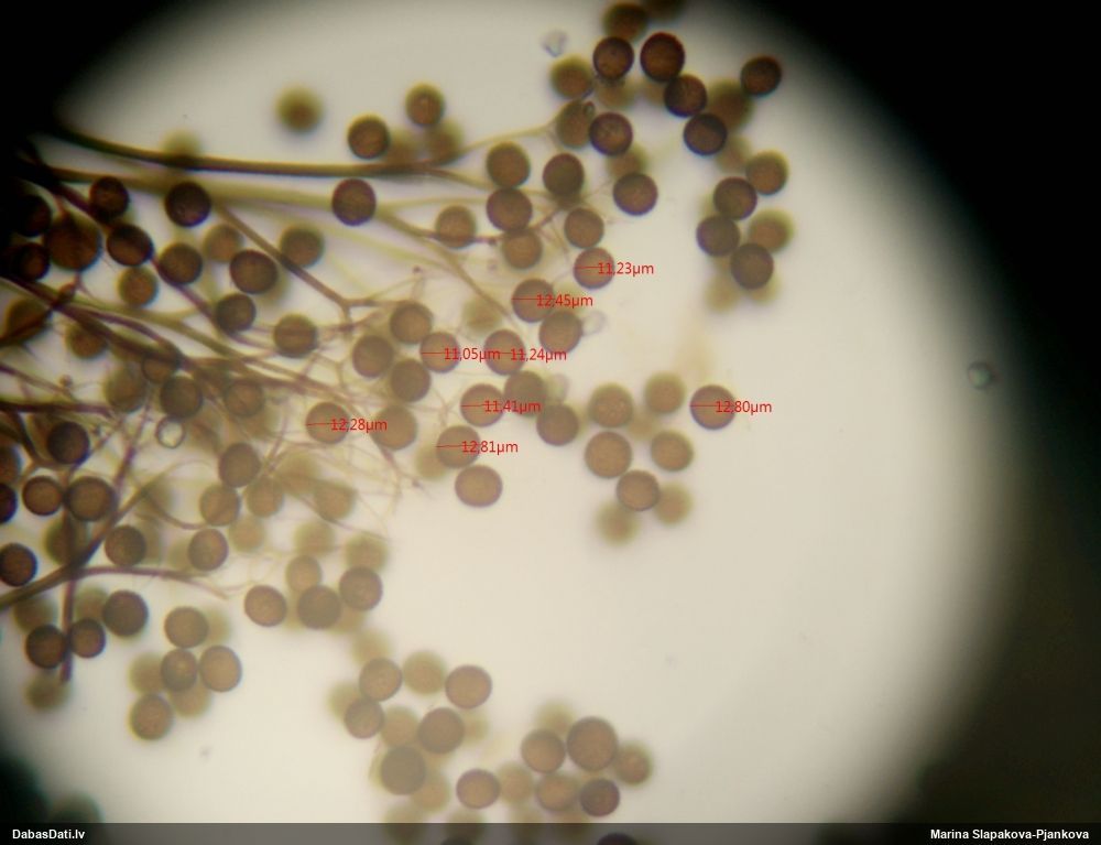 Sporas izskatās ļoti gaišas, varbūt nenobriedušas. Es laikam pēc kāda laiciņa mēģinātu vēlreiz mikroskopēt. Tajā pašā laikā sporu izmēri priekš T.contorta ir pamazi (ja tipiski ir 11-14 mkm, te ir knapi 11 mkm)