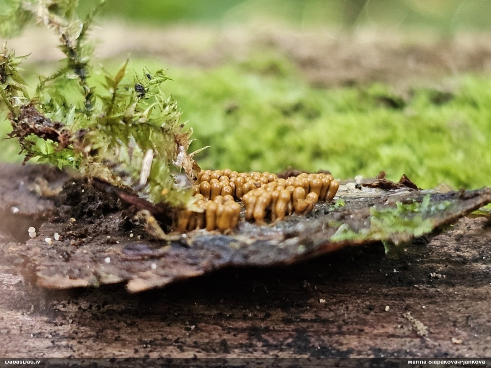 Man pēkšņi radās ideja - vai tur bija nu ļoti mitrs mikroklimats, egle ar melnalksni? Hipotētiski tādas dzeltenas var būt Diachea muscorum. Te bilde ir mazliet līdzīga: https://fr.wikipedia.org/wiki/Fichier:Craterium_muscorum,_Trawscoed,_North_Wales,_Aug_2016_-_Flickr_-_janetgraham84.jpg