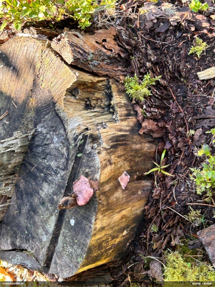 Satrūdējusi kritala mežā, nav dēļi. Iespējams, egle, jauktu koku mežs.