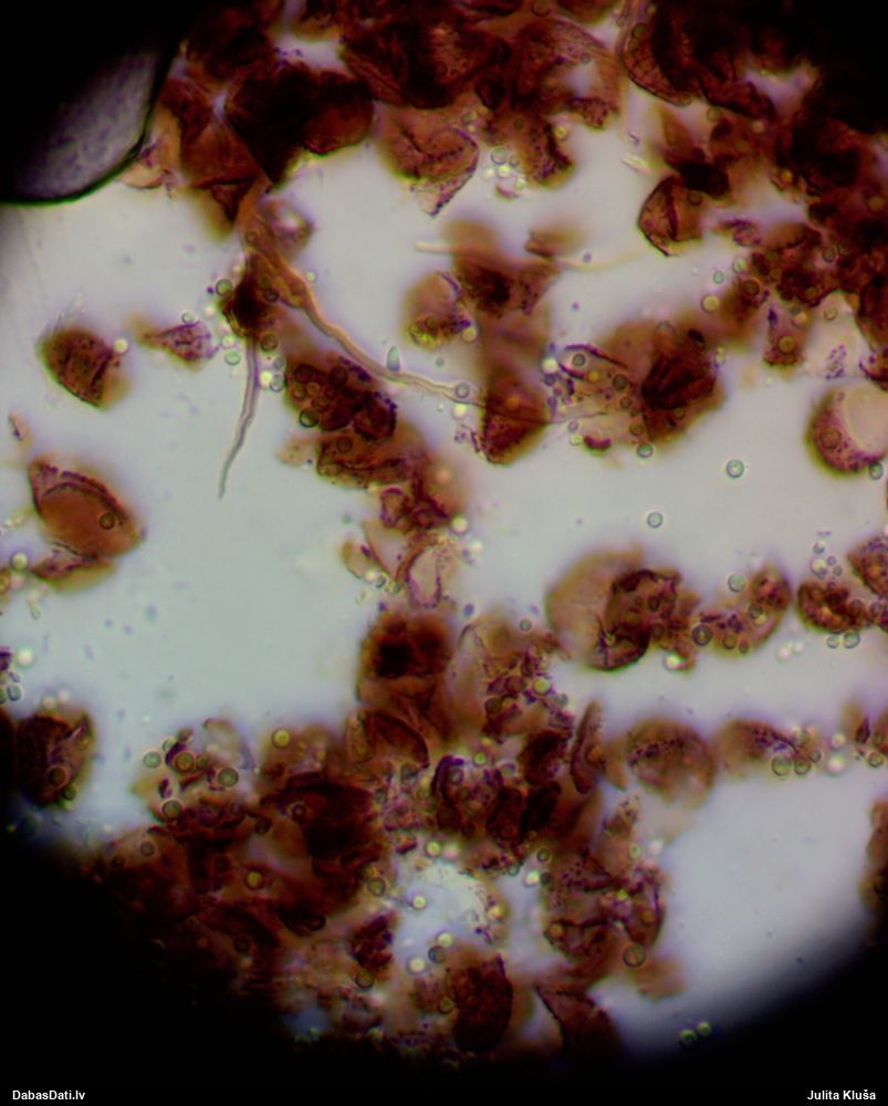 Liels paldies par paraugu! Mikroskopēju, viss kārtībā, kapilīcijs ir un suga pareiza. :) Un kā jau ir gadījies - tikko saņemu un apskatu paraugu, tā uzreiz ekspedīcijā izdodas atrast arī pašai (1 gab. augļķermeni :D). Ir pilnīgi droši, Raivo, bez Tava atraduma es arī nebūtu atradusi, jo uzmanību pievērsu, ka egle bija tieši tāda pati - slīpa un melna, tāpēc īpašs paldies par biotopa un substrāta bildēm! Kad ieraudzīju koka atbilstību, tad meklēju, kamēr atradu. :)