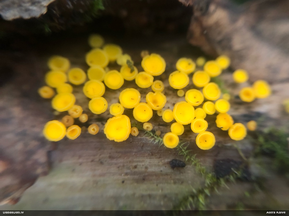 Man pēkšņi radās ideja - vai tur bija nu ļoti mitrs mikroklimats, egle ar melnalksni? Hipotētiski tādas dzeltenas var būt Diachea muscorum. Te bilde ir mazliet līdzīga: https://fr.wikipedia.org/wiki/Fichier:Craterium_muscorum,_Trawscoed,_North_Wales,_Aug_2016_-_Flickr_-_janetgraham84.jpg