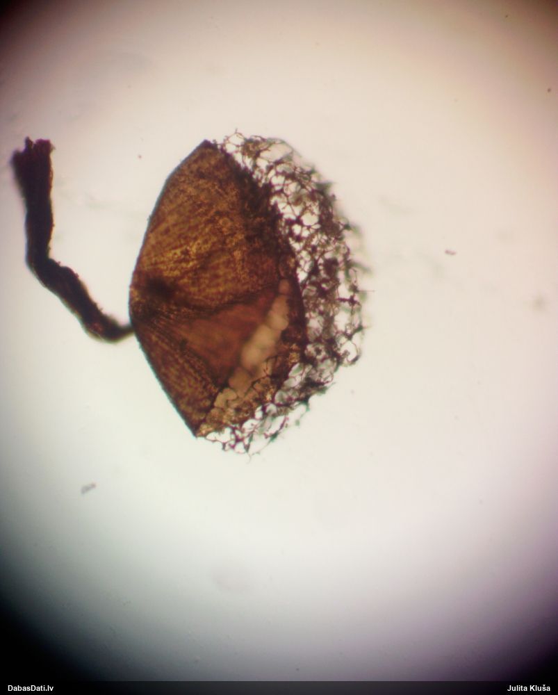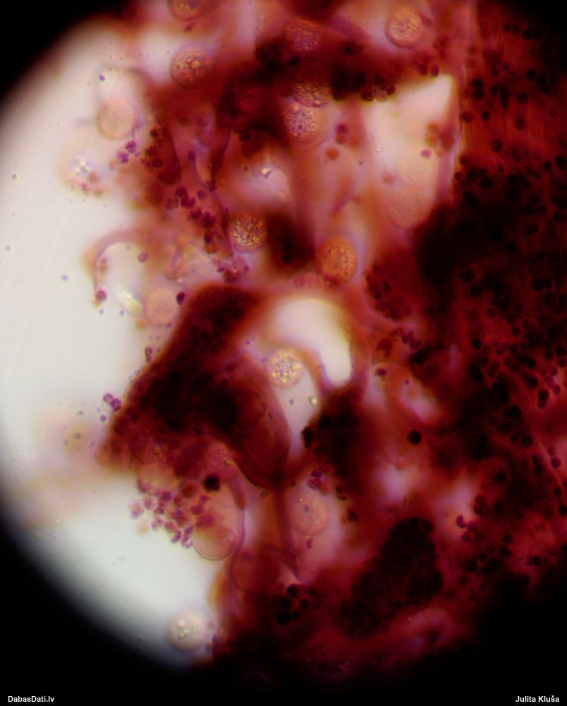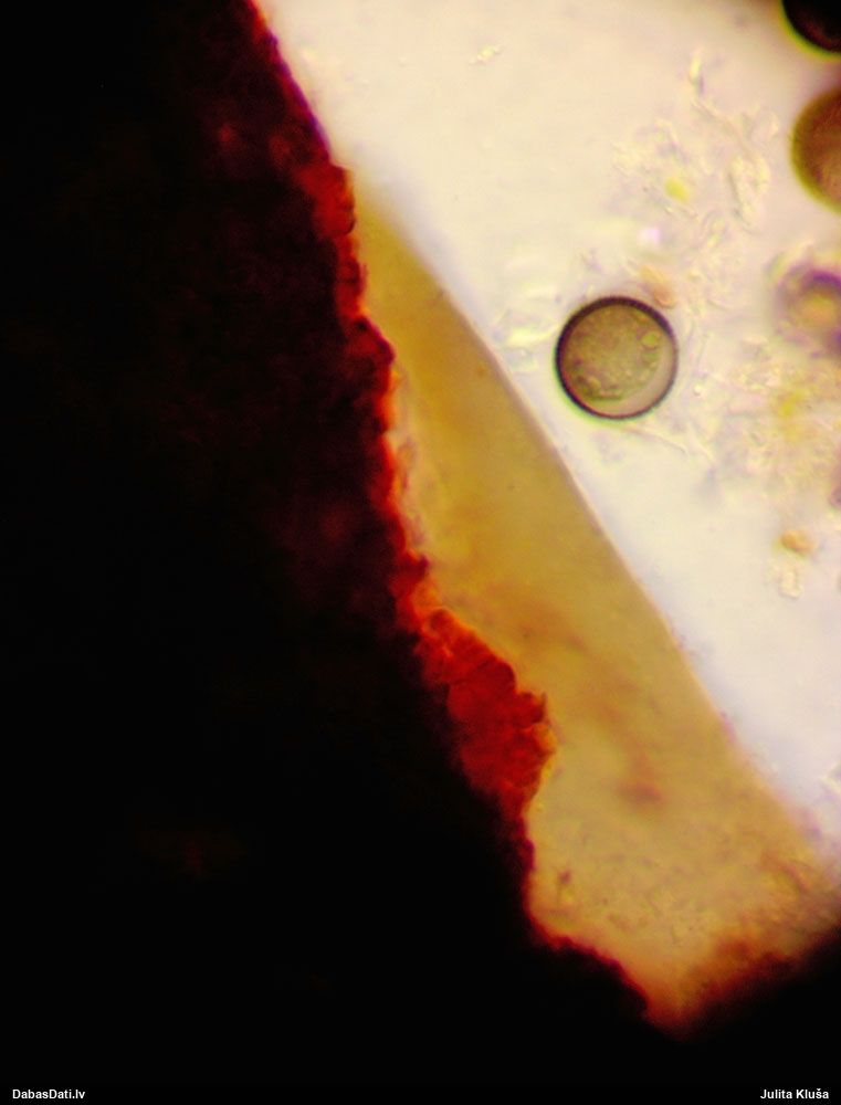 Liels paldies par paraugu! Mikroskopēju, viss kārtībā, kapilīcijs ir un suga pareiza. :) Un kā jau ir gadījies - tikko saņemu un apskatu paraugu, tā uzreiz ekspedīcijā izdodas atrast arī pašai (1 gab. augļķermeni :D). Ir pilnīgi droši, Raivo, bez Tava atraduma es arī nebūtu atradusi, jo uzmanību pievērsu, ka egle bija tieši tāda pati - slīpa un melna, tāpēc īpašs paldies par biotopa un substrāta bildēm! Kad ieraudzīju koka atbilstību, tad meklēju, kamēr atradu. :)