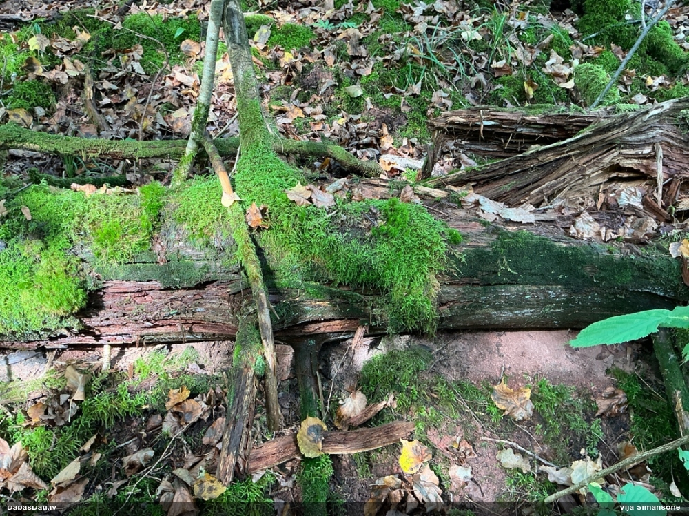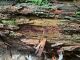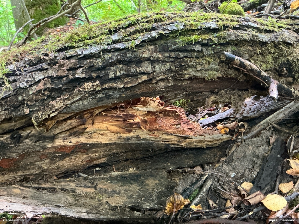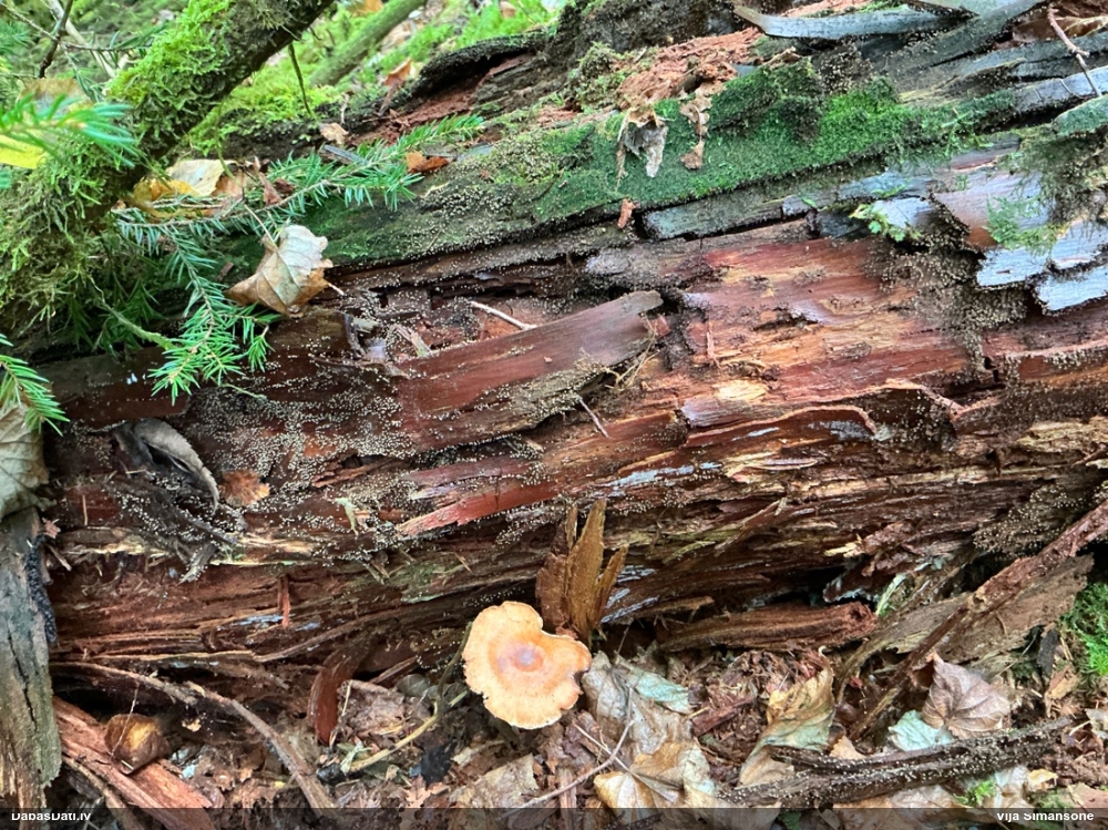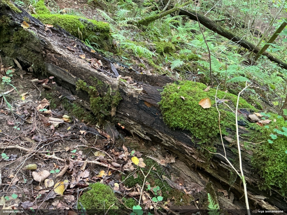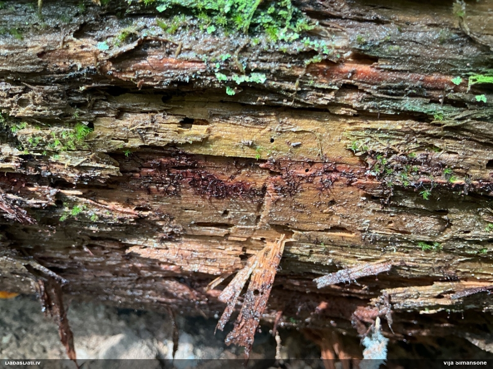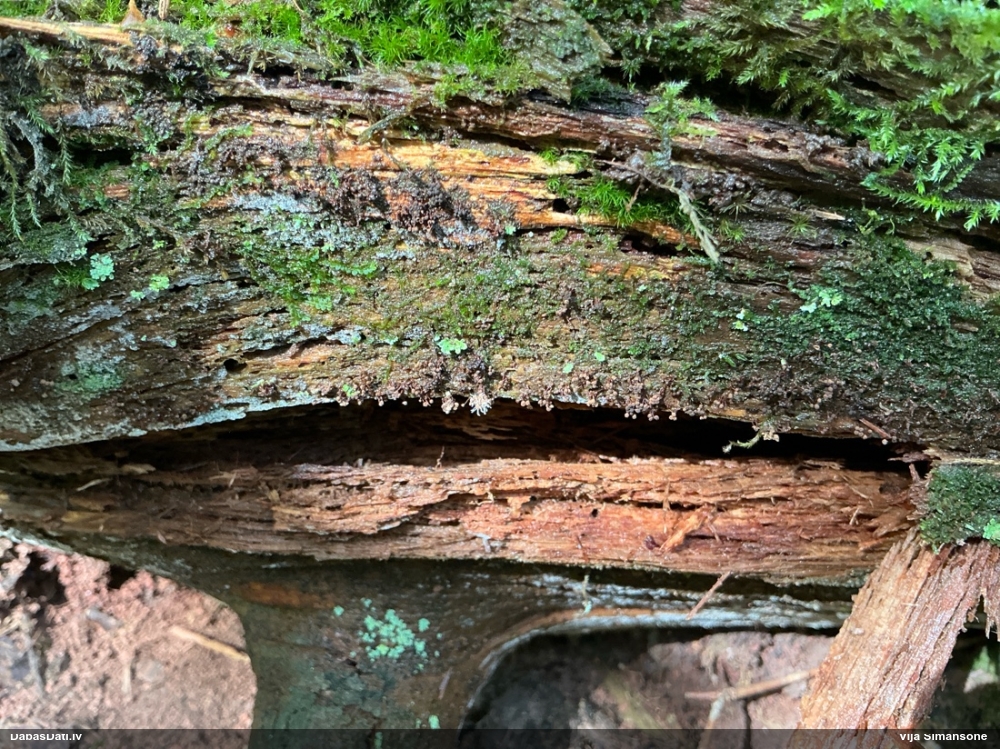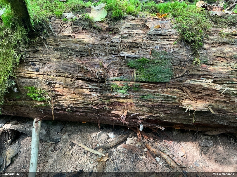 Satrūdējusi kritala mežā, nav dēļi. Iespējams, egle, jauktu koku mežs.