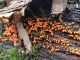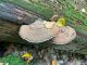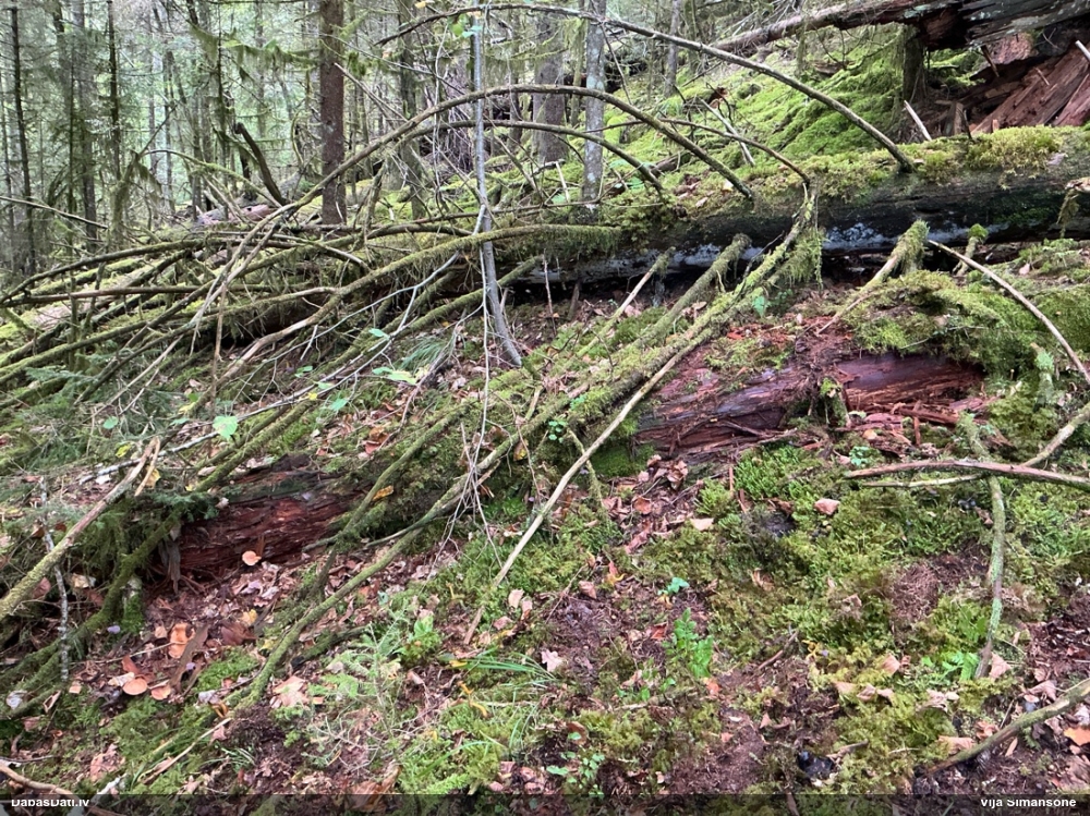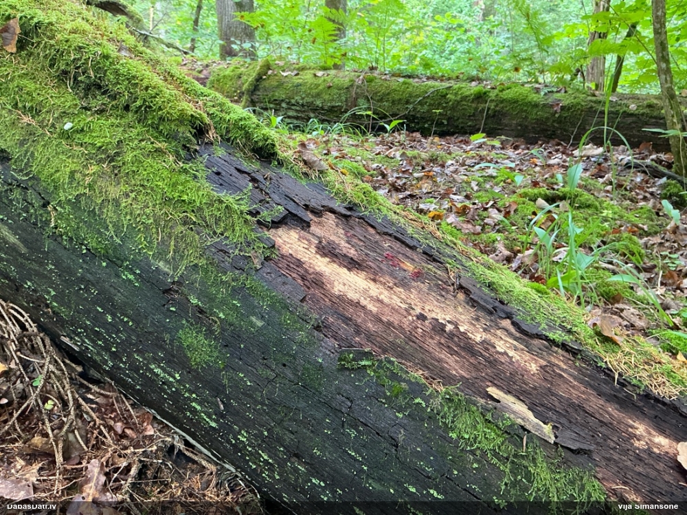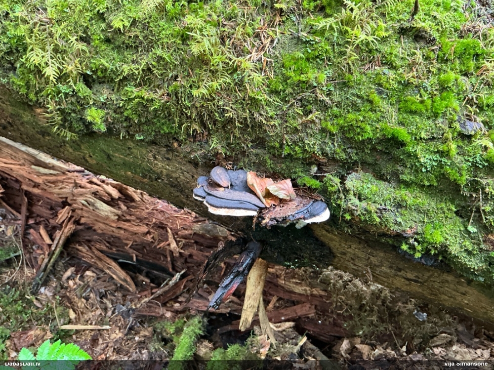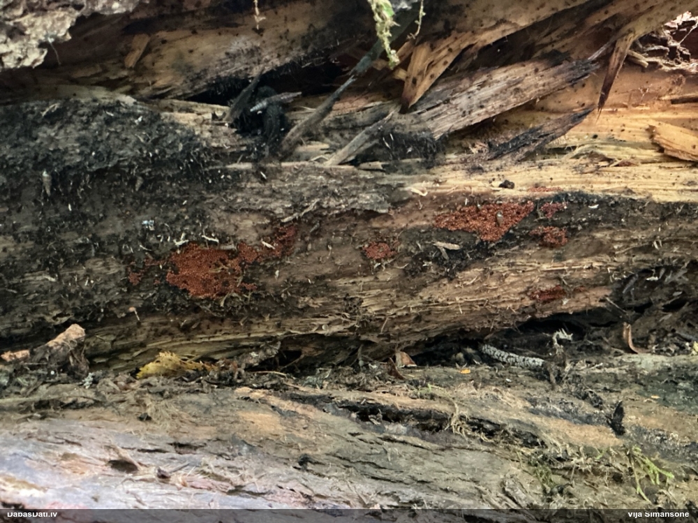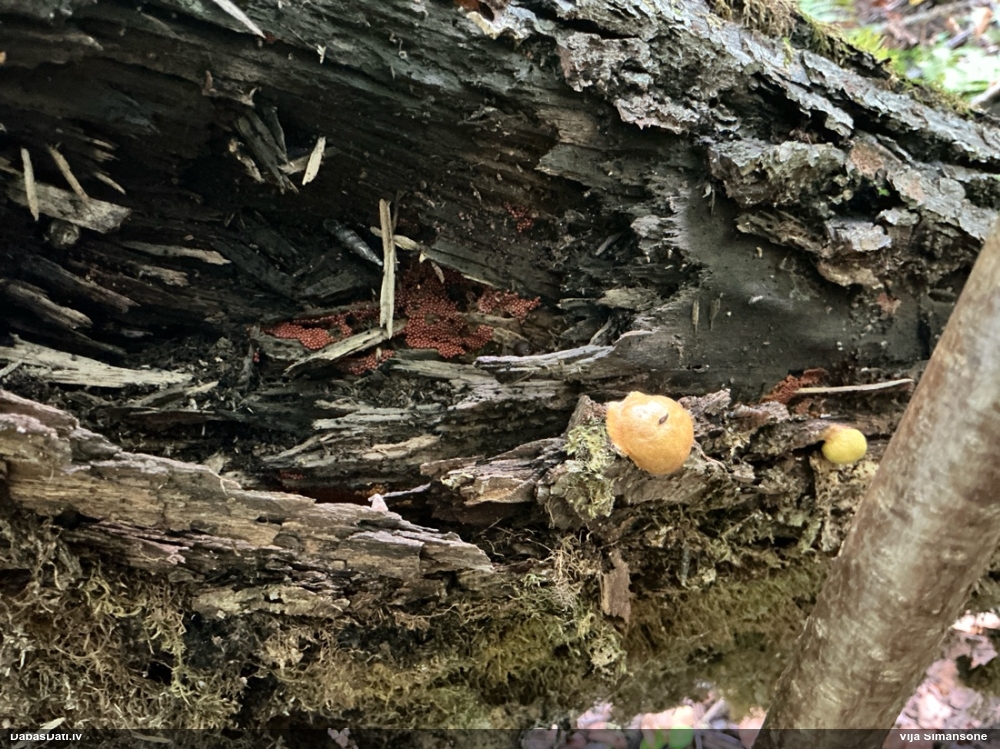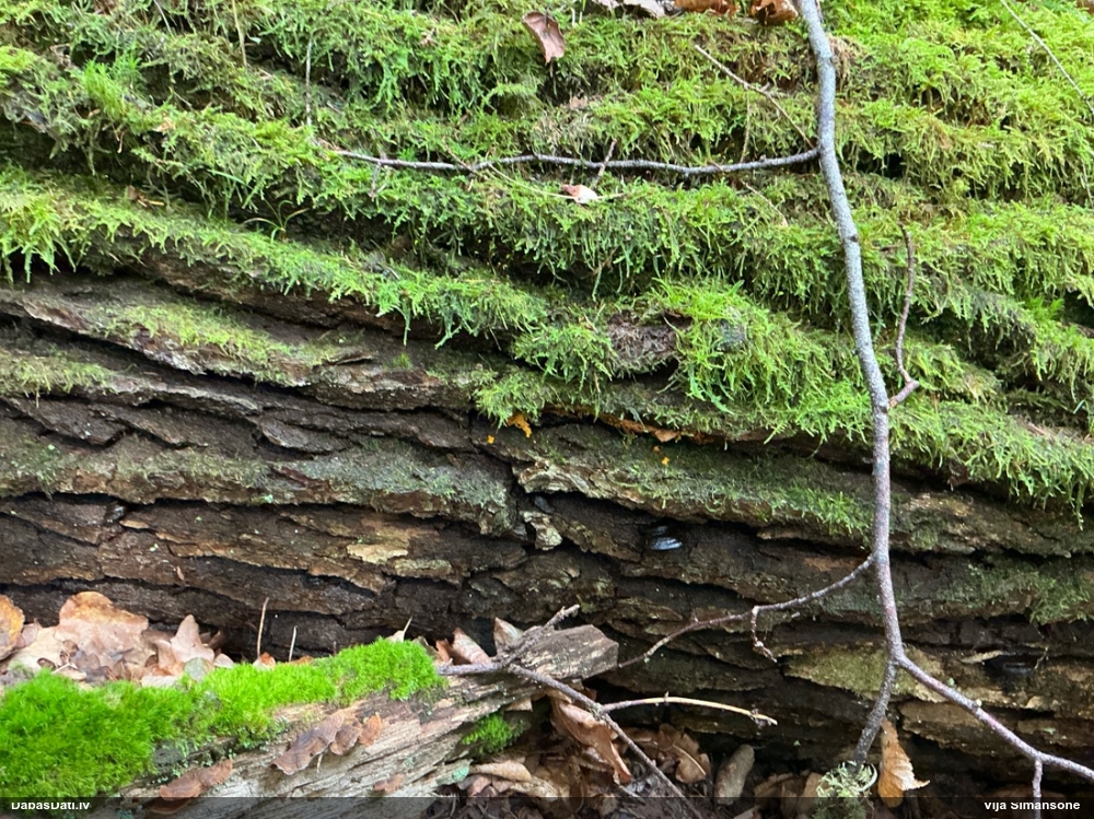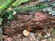 Satrūdējusi kritala mežā, nav dēļi. Iespējams, egle, jauktu koku mežs.