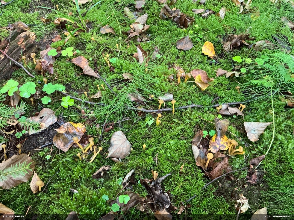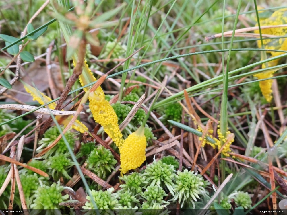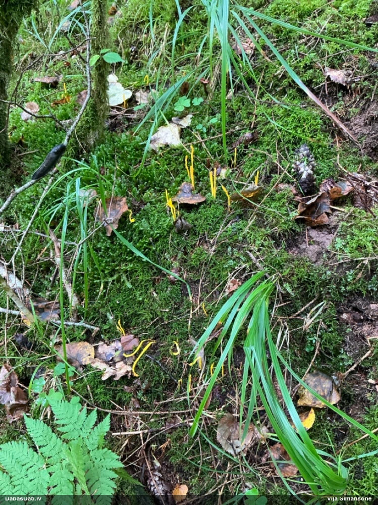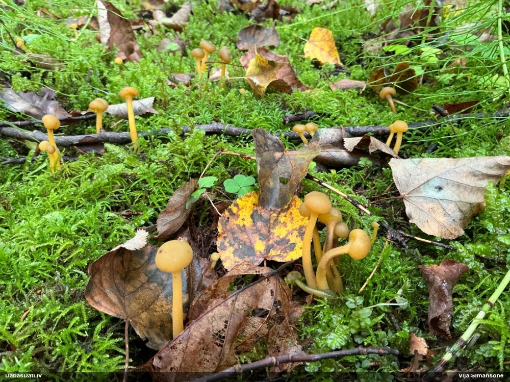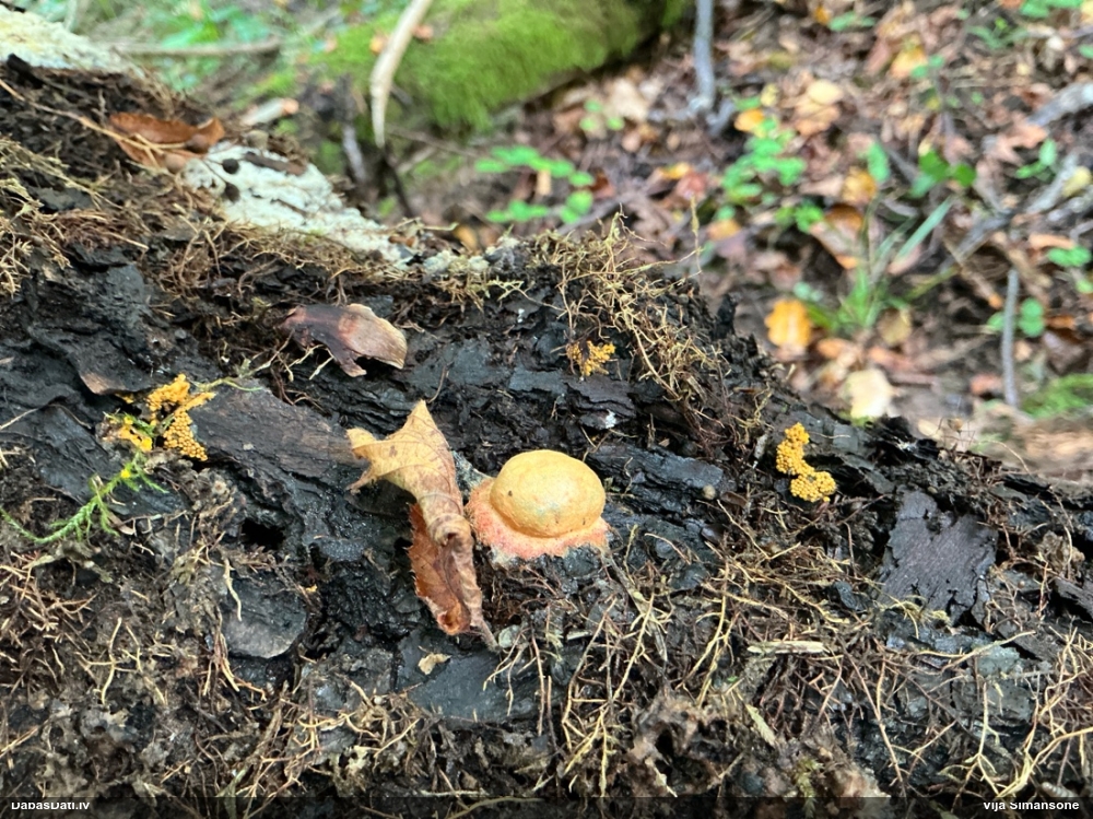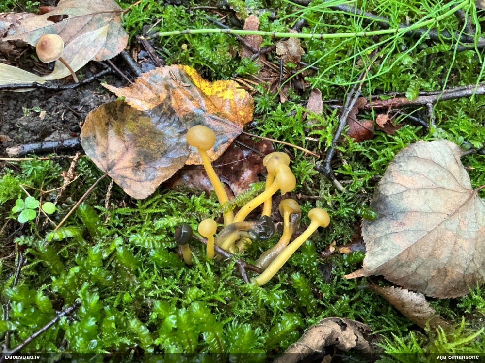 Man pēkšņi radās ideja - vai tur bija nu ļoti mitrs mikroklimats, egle ar melnalksni? Hipotētiski tādas dzeltenas var būt Diachea muscorum. Te bilde ir mazliet līdzīga: https://fr.wikipedia.org/wiki/Fichier:Craterium_muscorum,_Trawscoed,_North_Wales,_Aug_2016_-_Flickr_-_janetgraham84.jpg