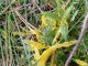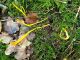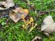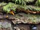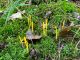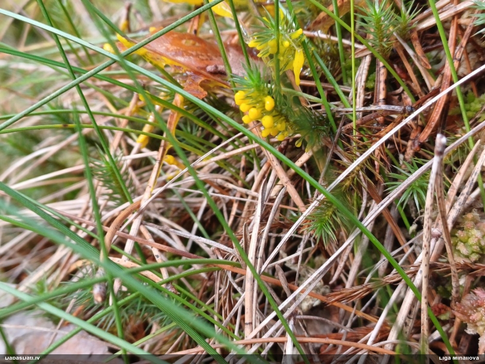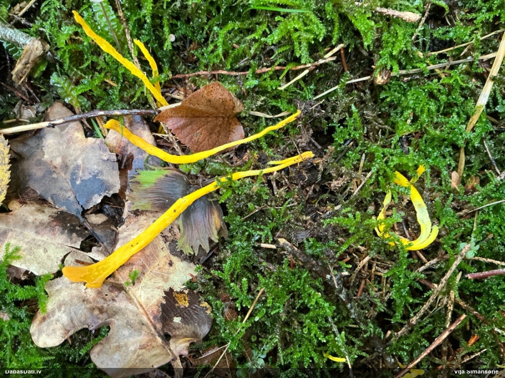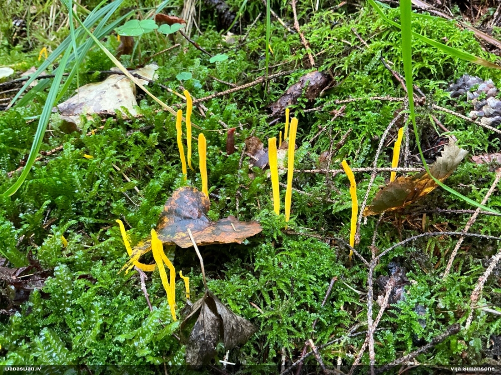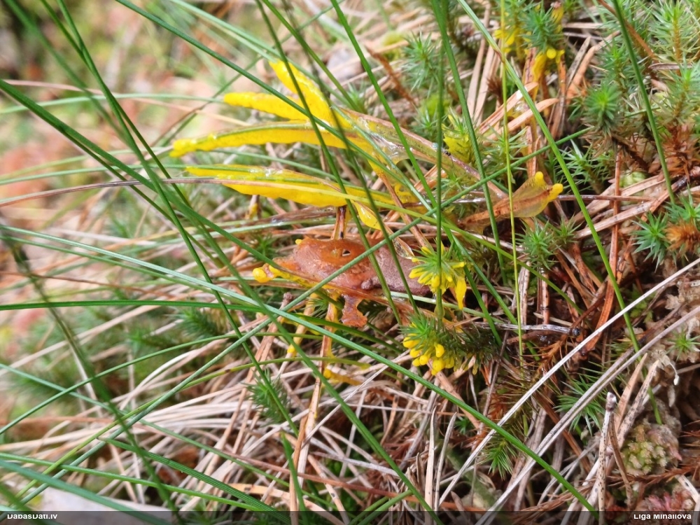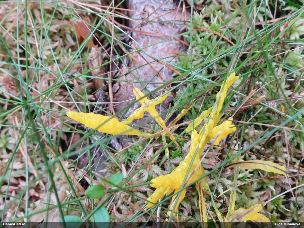 Man pēkšņi radās ideja - vai tur bija nu ļoti mitrs mikroklimats, egle ar melnalksni? Hipotētiski tādas dzeltenas var būt Diachea muscorum. Te bilde ir mazliet līdzīga: https://fr.wikipedia.org/wiki/Fichier:Craterium_muscorum,_Trawscoed,_North_Wales,_Aug_2016_-_Flickr_-_janetgraham84.jpg