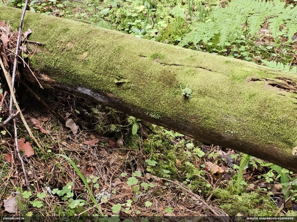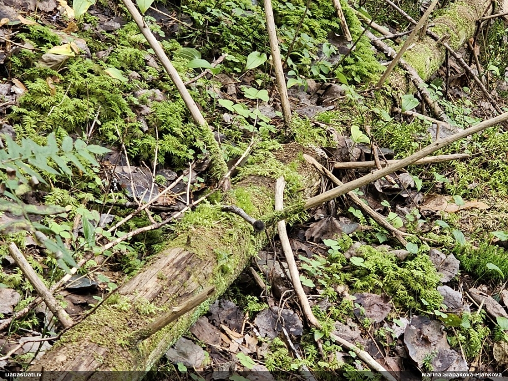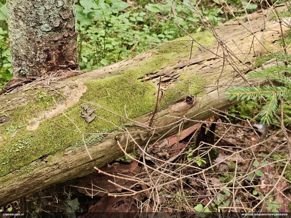 Satrūdējusi kritala mežā, nav dēļi. Iespējams, egle, jauktu koku mežs.