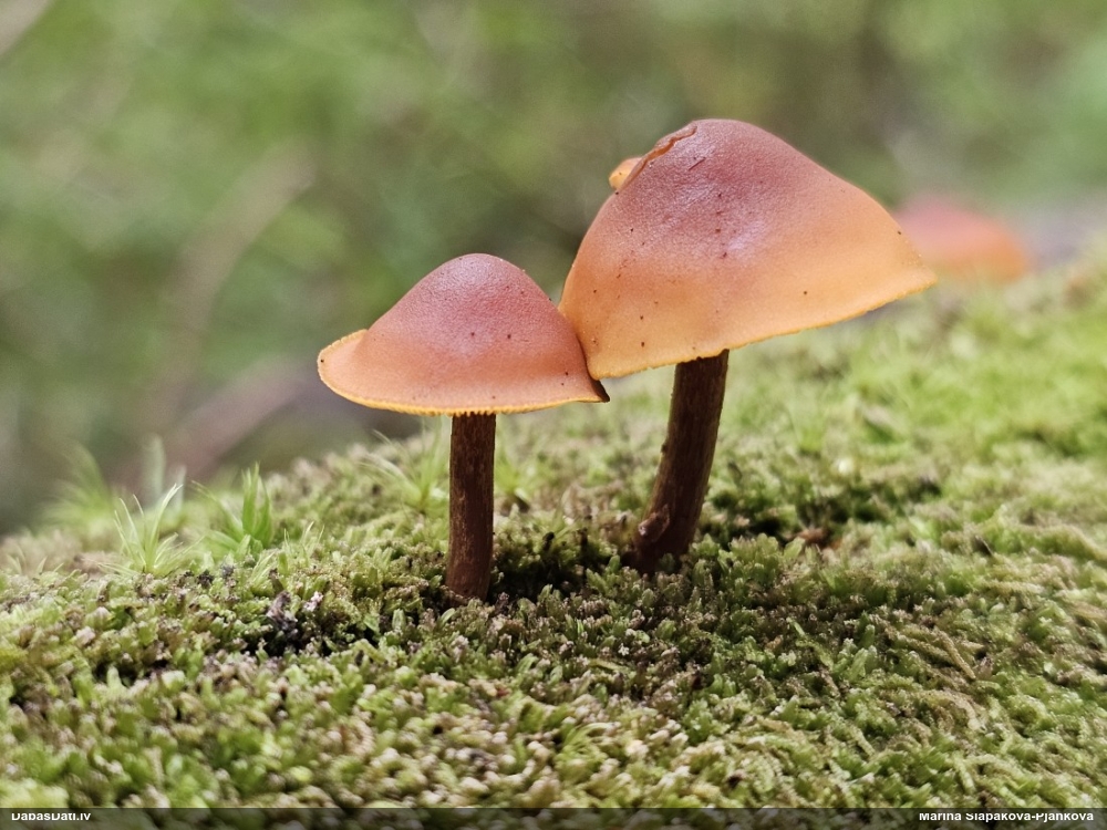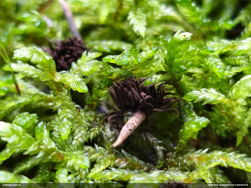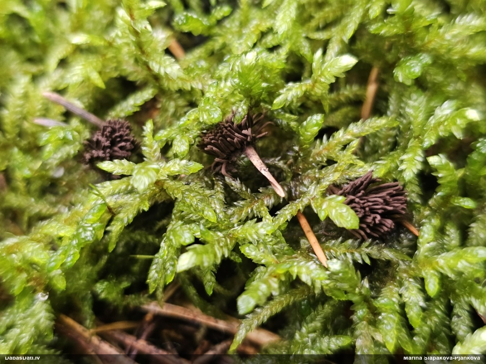 Man pēkšņi radās ideja - vai tur bija nu ļoti mitrs mikroklimats, egle ar melnalksni? Hipotētiski tādas dzeltenas var būt Diachea muscorum. Te bilde ir mazliet līdzīga: https://fr.wikipedia.org/wiki/Fichier:Craterium_muscorum,_Trawscoed,_North_Wales,_Aug_2016_-_Flickr_-_janetgraham84.jpg