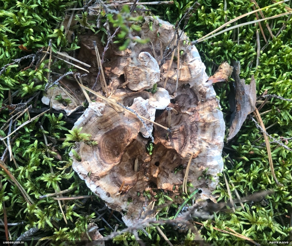 Satrūdējusi kritala mežā, nav dēļi. Iespējams, egle, jauktu koku mežs.