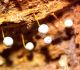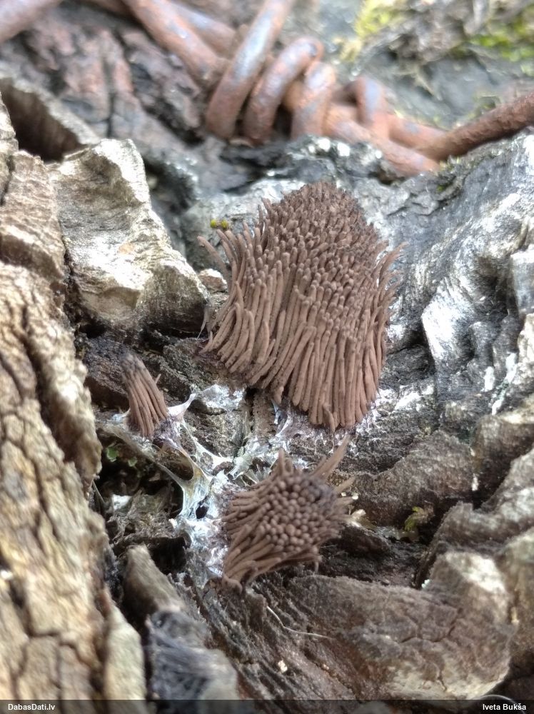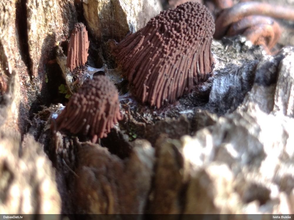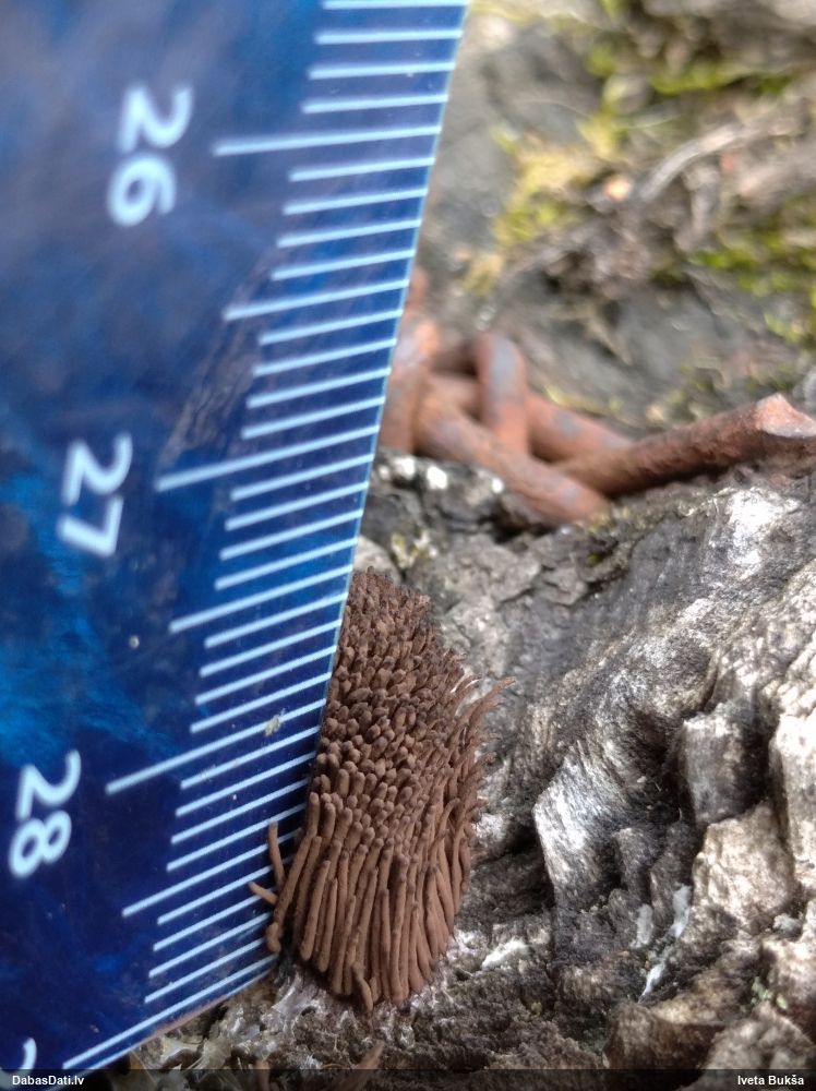 Vai tik nebūs medainā bumbulīte? Augļķermeņi vertikāli izstiepti, sporu mākonis ciešā klājienā.