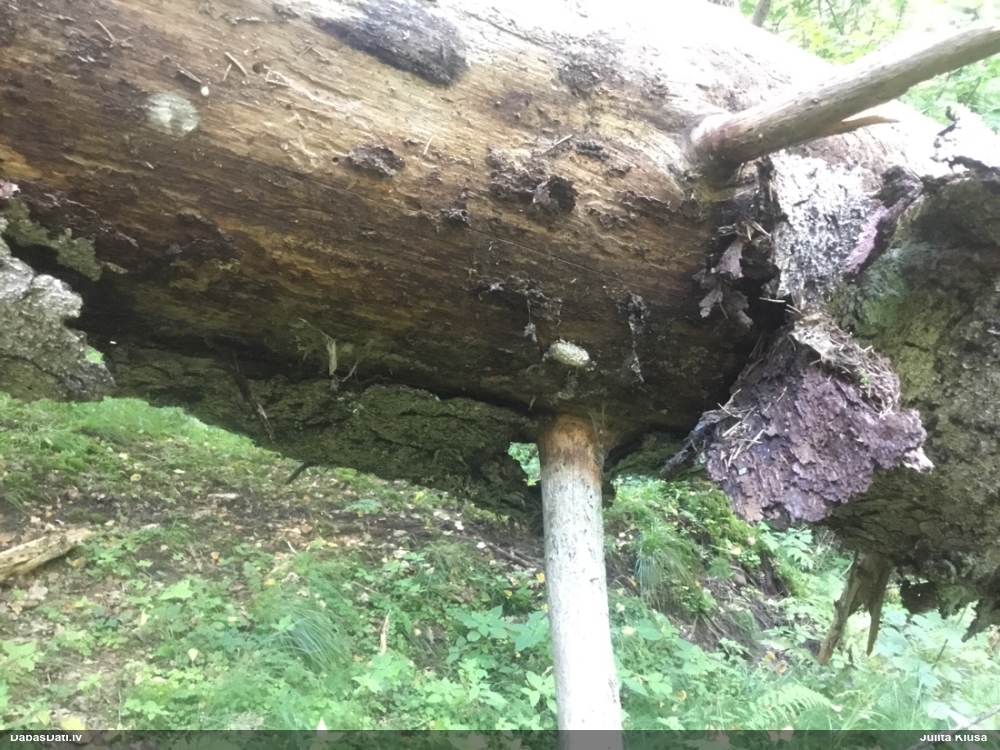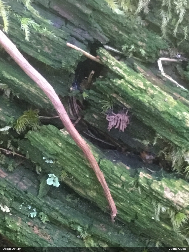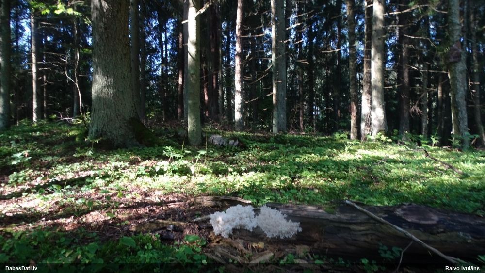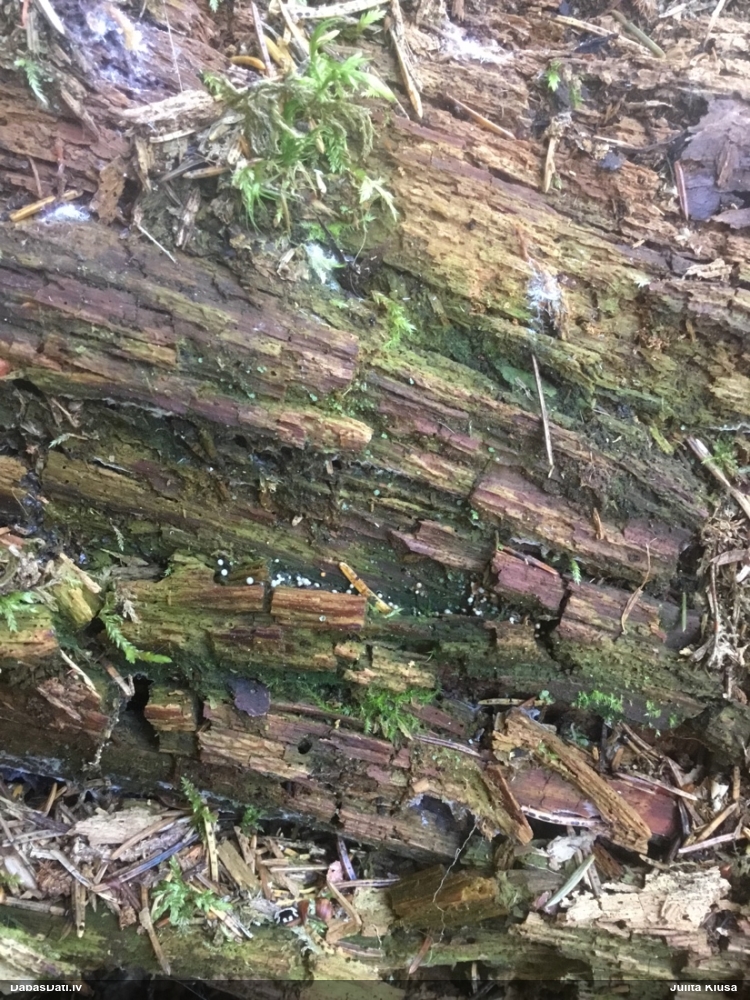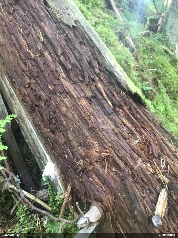 Satrūdējusi kritala mežā, nav dēļi. Iespējams, egle, jauktu koku mežs.