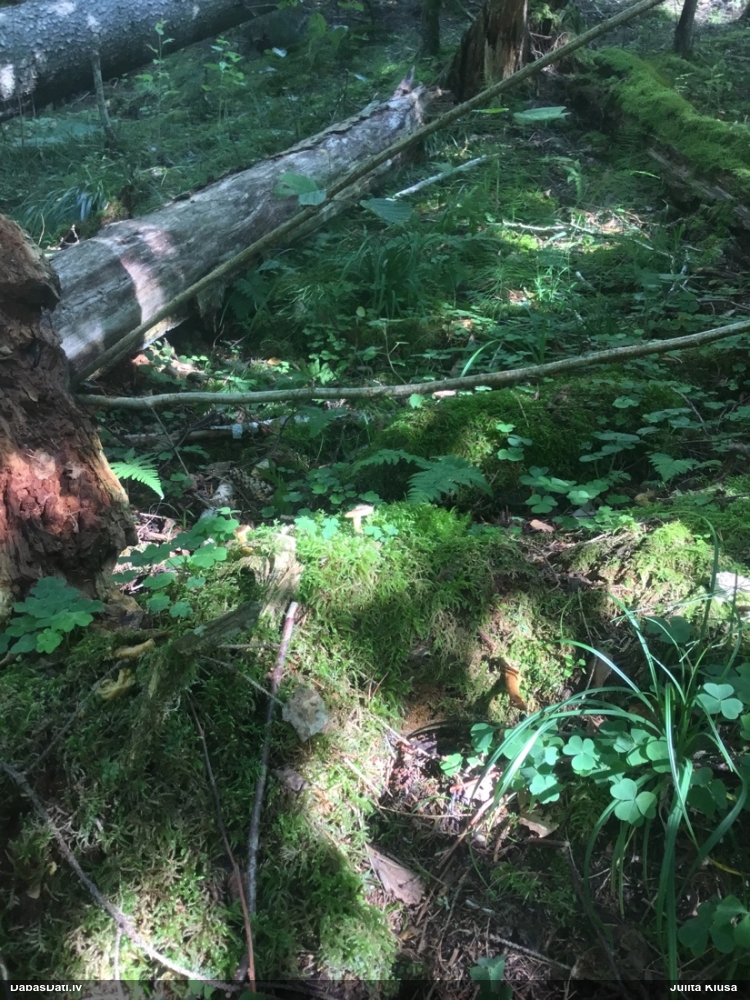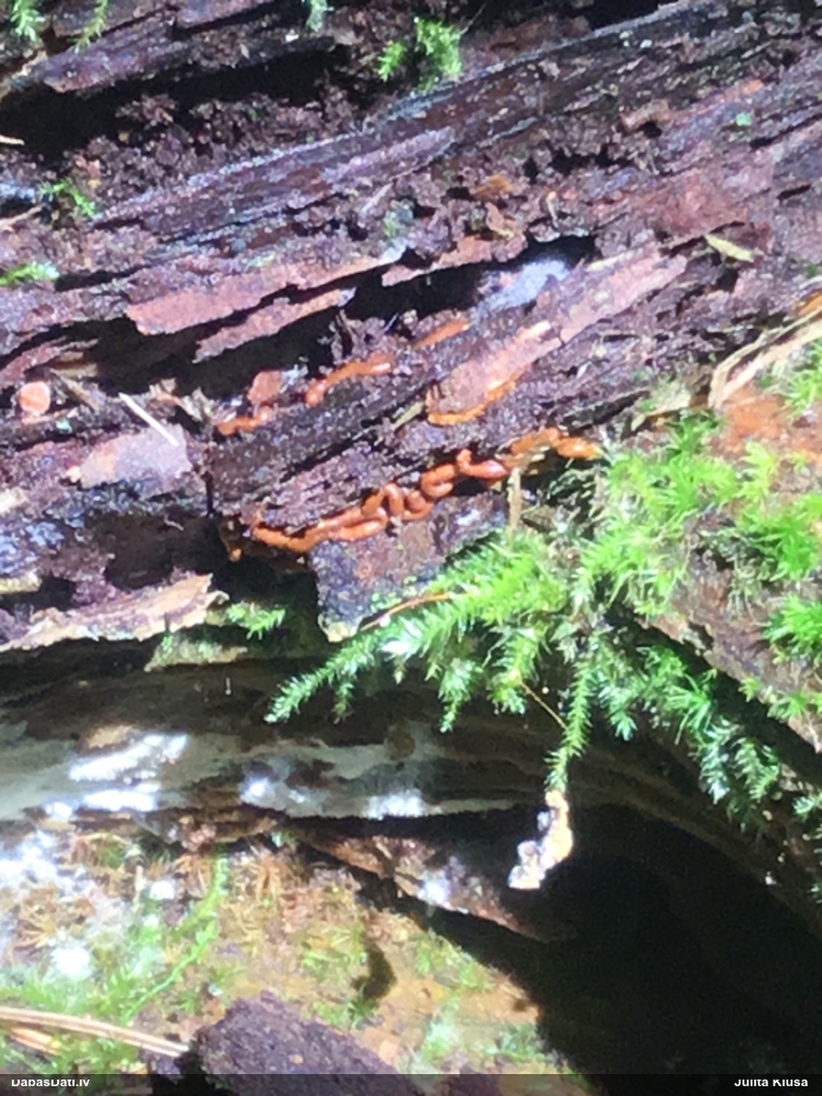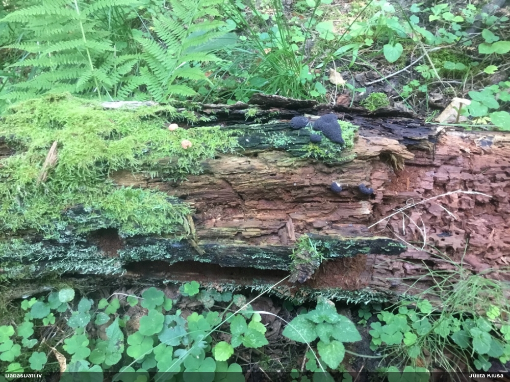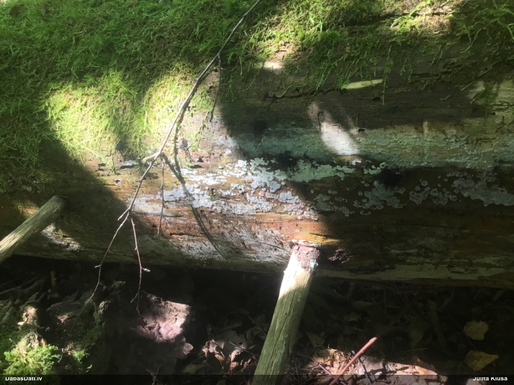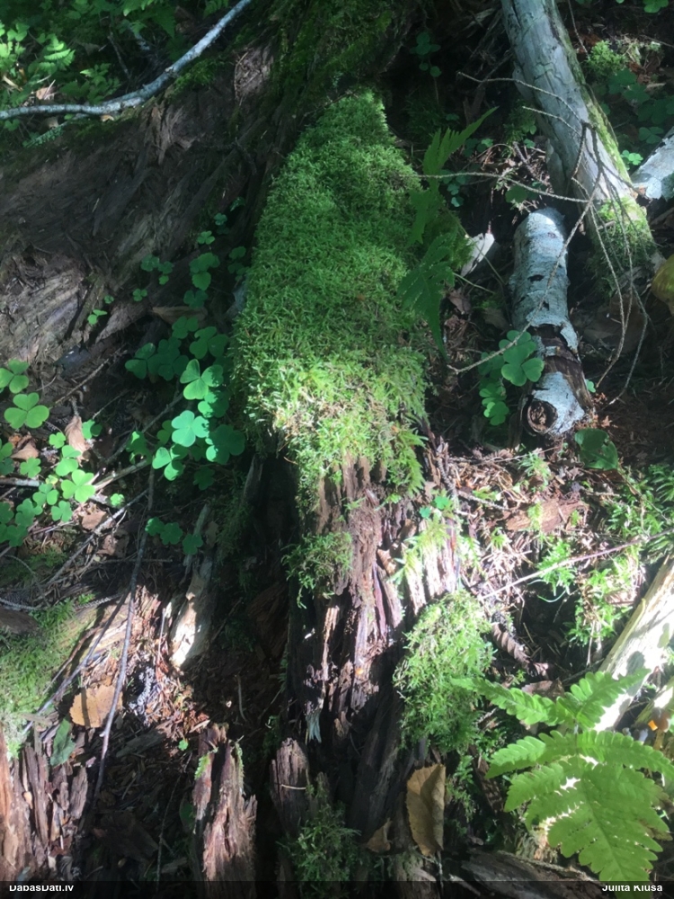 Satrūdējusi kritala mežā, nav dēļi. Iespējams, egle, jauktu koku mežs.