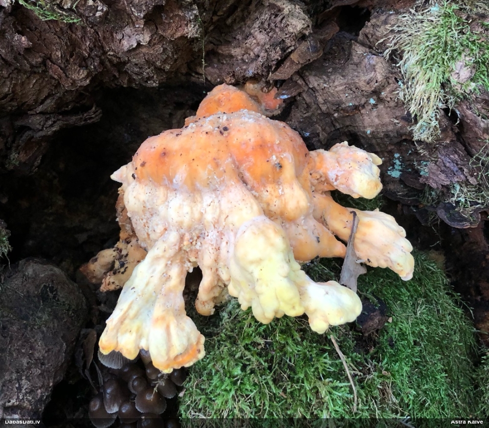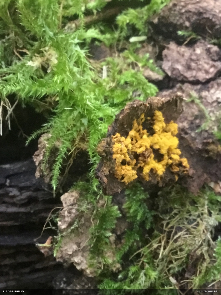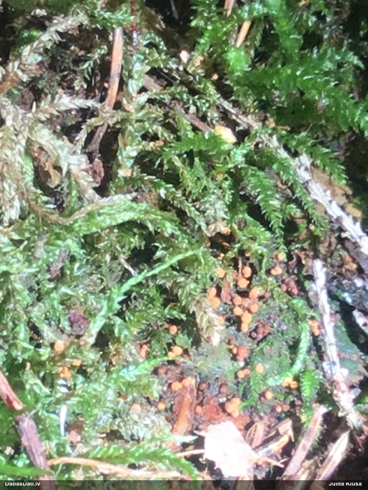 Man pēkšņi radās ideja - vai tur bija nu ļoti mitrs mikroklimats, egle ar melnalksni? Hipotētiski tādas dzeltenas var būt Diachea muscorum. Te bilde ir mazliet līdzīga: https://fr.wikipedia.org/wiki/Fichier:Craterium_muscorum,_Trawscoed,_North_Wales,_Aug_2016_-_Flickr_-_janetgraham84.jpg