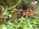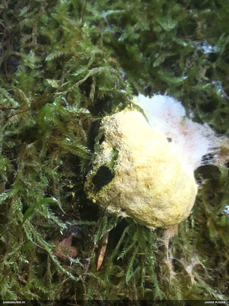 Man pēkšņi radās ideja - vai tur bija nu ļoti mitrs mikroklimats, egle ar melnalksni? Hipotētiski tādas dzeltenas var būt Diachea muscorum. Te bilde ir mazliet līdzīga: https://fr.wikipedia.org/wiki/Fichier:Craterium_muscorum,_Trawscoed,_North_Wales,_Aug_2016_-_Flickr_-_janetgraham84.jpg
