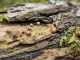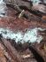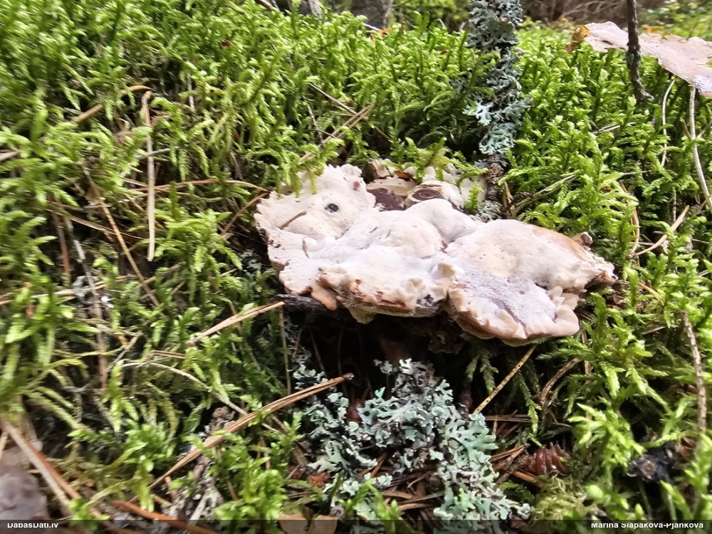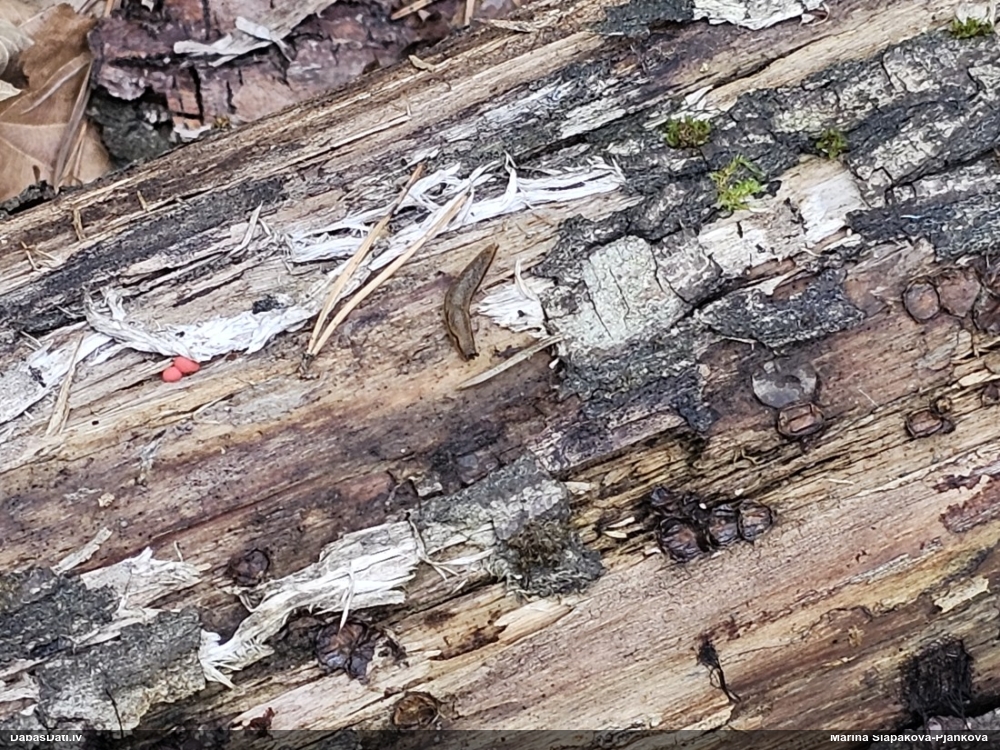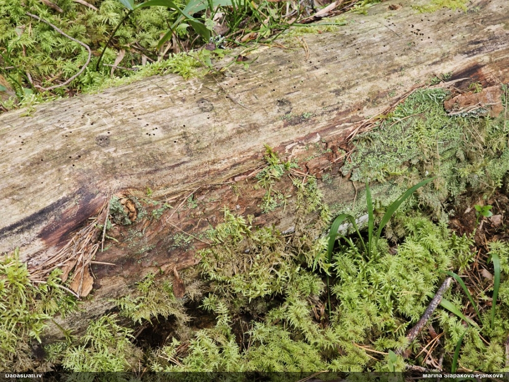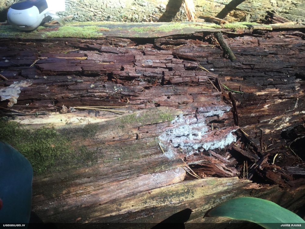 Satrūdējusi kritala mežā, nav dēļi. Iespējams, egle, jauktu koku mežs.