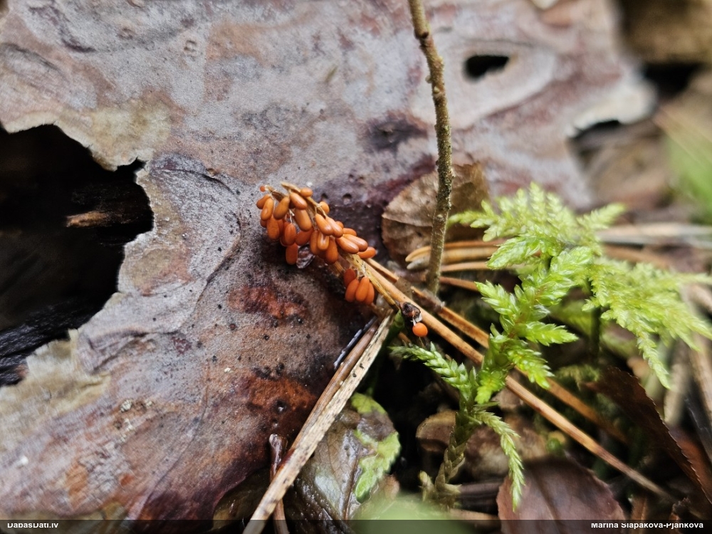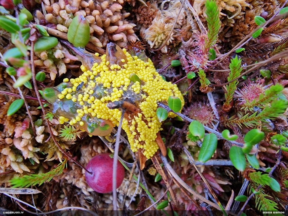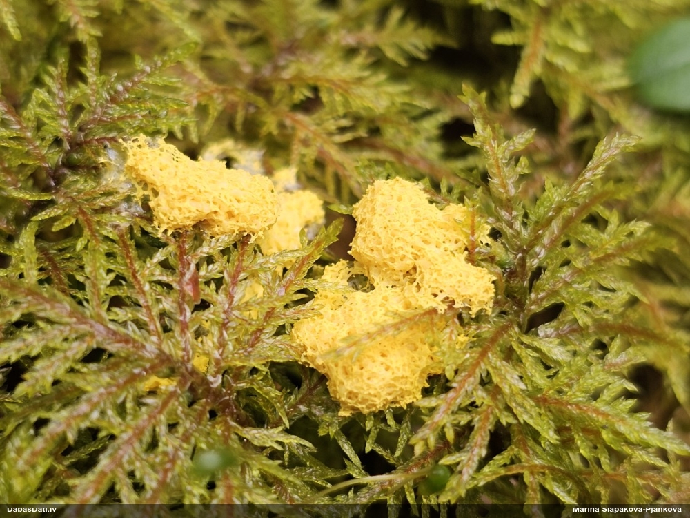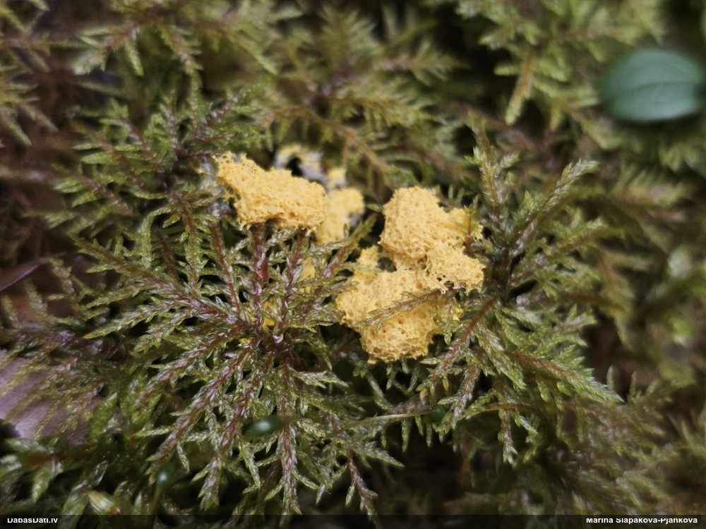 Man pēkšņi radās ideja - vai tur bija nu ļoti mitrs mikroklimats, egle ar melnalksni? Hipotētiski tādas dzeltenas var būt Diachea muscorum. Te bilde ir mazliet līdzīga: https://fr.wikipedia.org/wiki/Fichier:Craterium_muscorum,_Trawscoed,_North_Wales,_Aug_2016_-_Flickr_-_janetgraham84.jpg