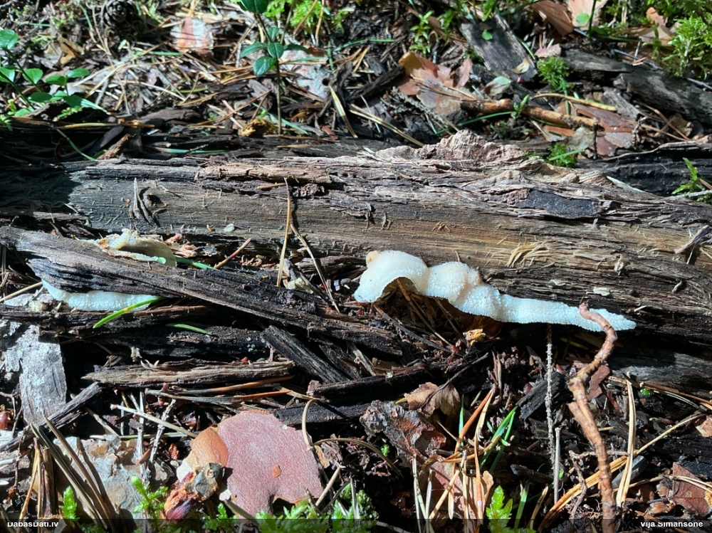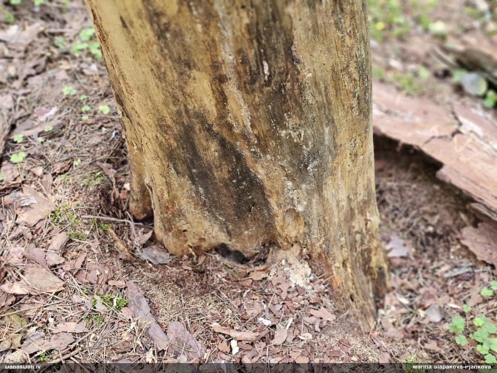 Satrūdējusi kritala mežā, nav dēļi. Iespējams, egle, jauktu koku mežs.