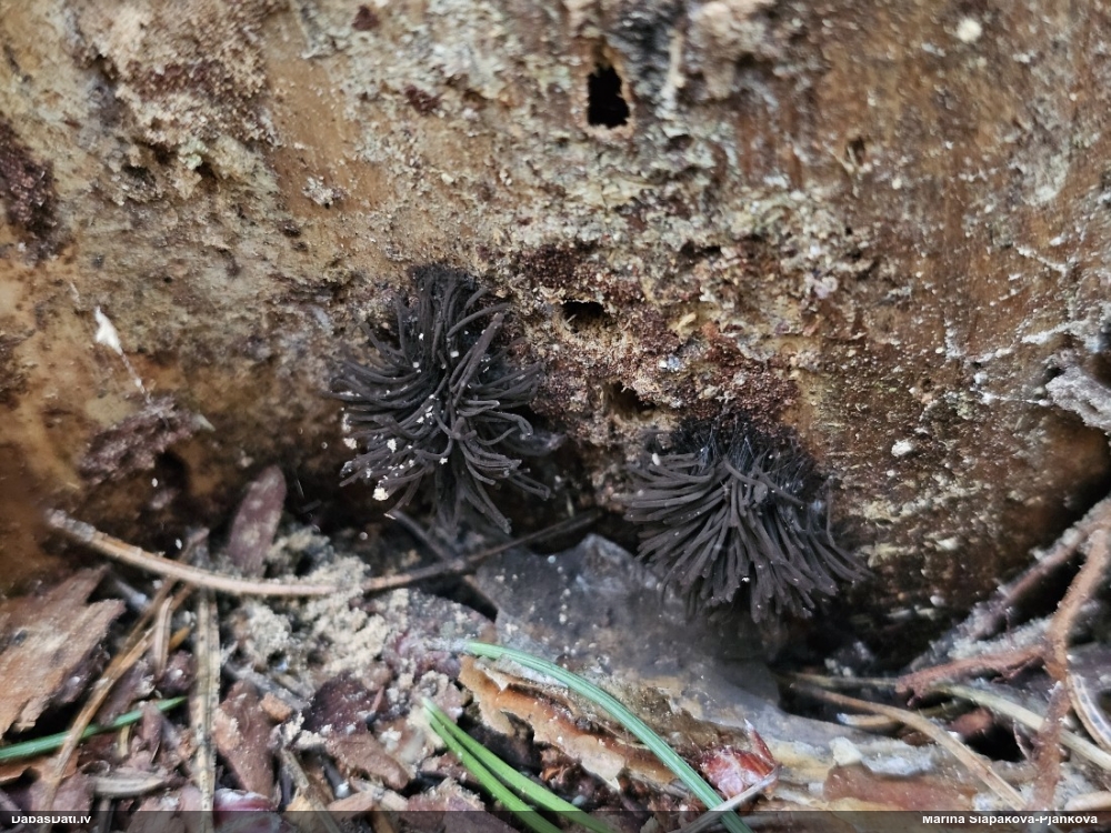 Vai tik nebūs medainā bumbulīte? Augļķermeņi vertikāli izstiepti, sporu mākonis ciešā klājienā.