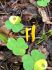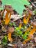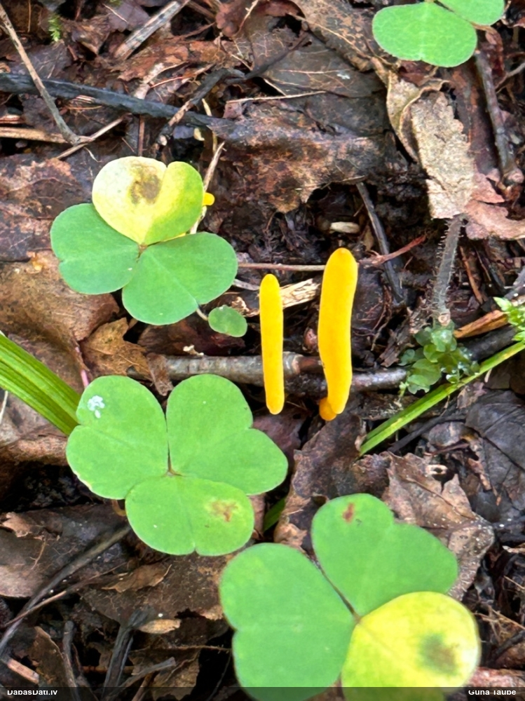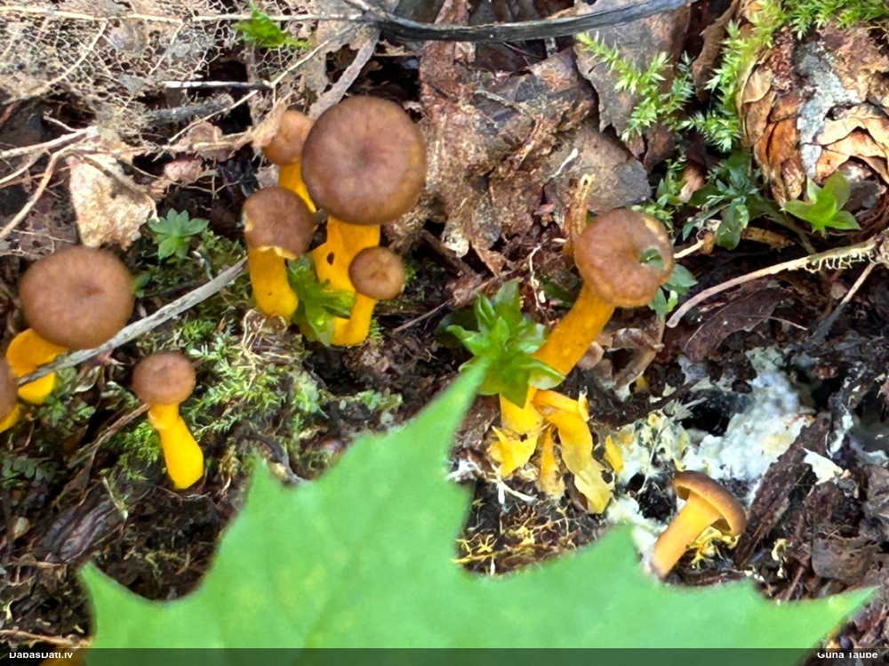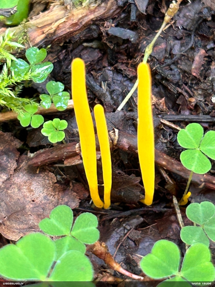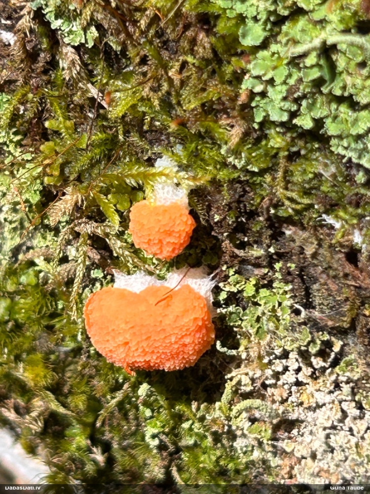 Man pēkšņi radās ideja - vai tur bija nu ļoti mitrs mikroklimats, egle ar melnalksni? Hipotētiski tādas dzeltenas var būt Diachea muscorum. Te bilde ir mazliet līdzīga: https://fr.wikipedia.org/wiki/Fichier:Craterium_muscorum,_Trawscoed,_North_Wales,_Aug_2016_-_Flickr_-_janetgraham84.jpg