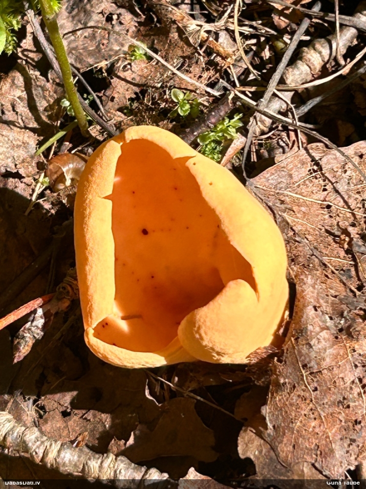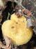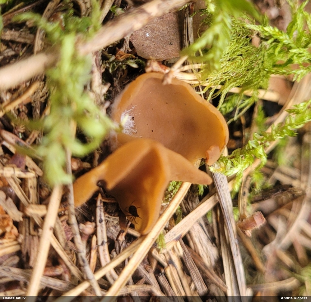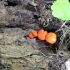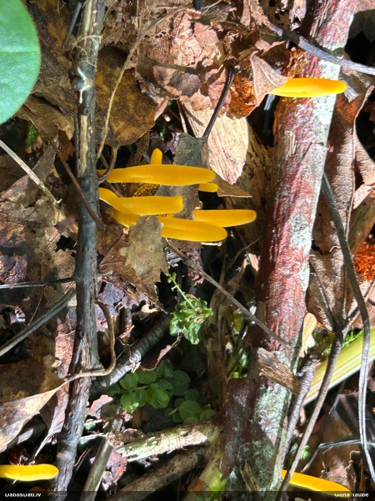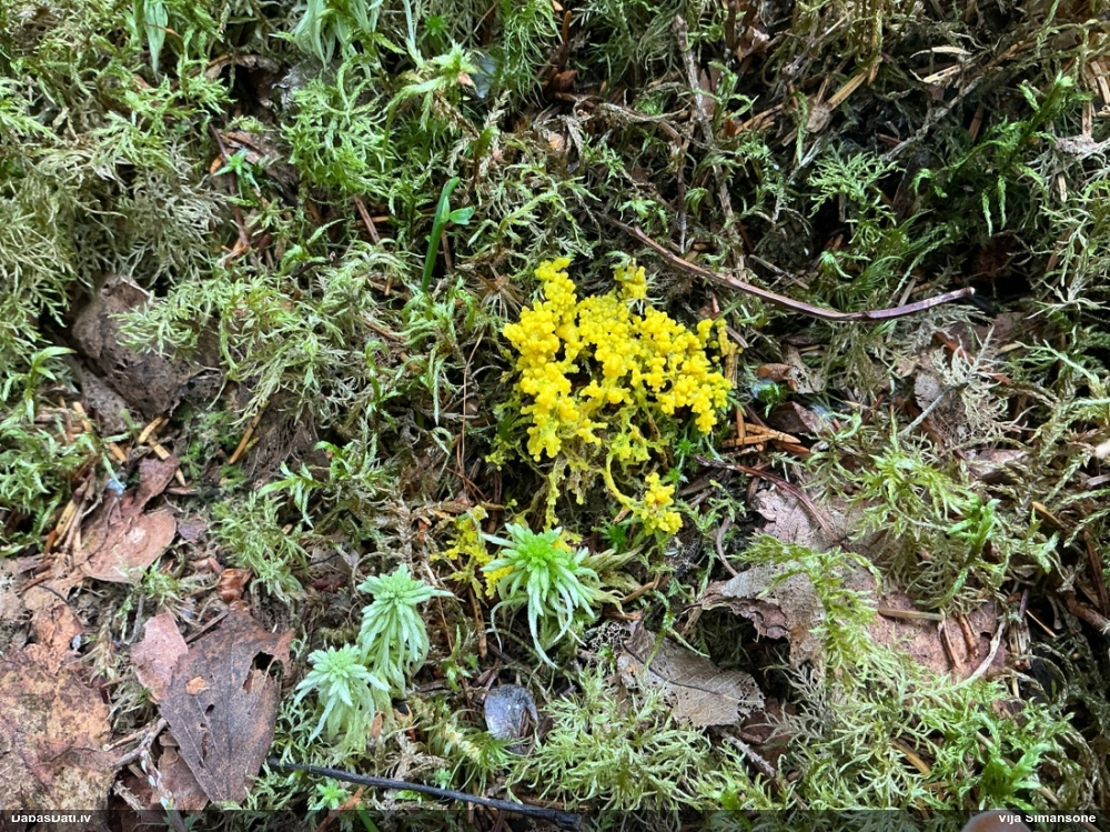 Man pēkšņi radās ideja - vai tur bija nu ļoti mitrs mikroklimats, egle ar melnalksni? Hipotētiski tādas dzeltenas var būt Diachea muscorum. Te bilde ir mazliet līdzīga: https://fr.wikipedia.org/wiki/Fichier:Craterium_muscorum,_Trawscoed,_North_Wales,_Aug_2016_-_Flickr_-_janetgraham84.jpg