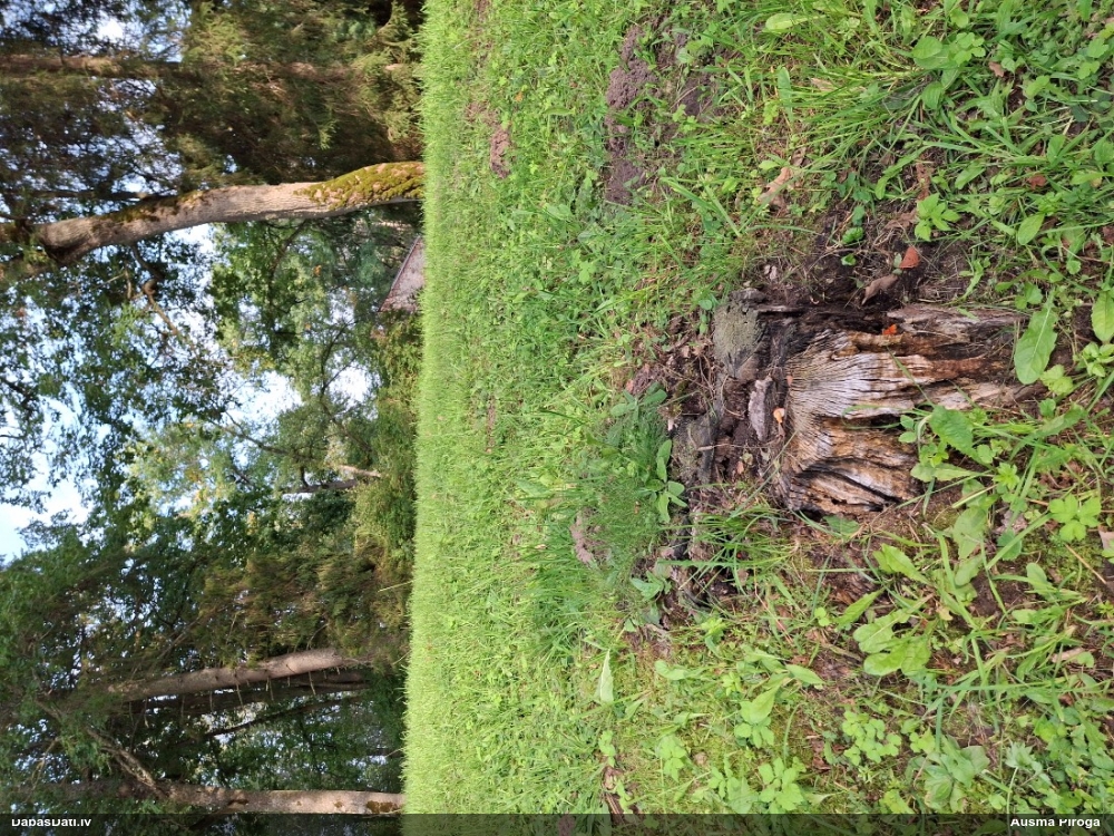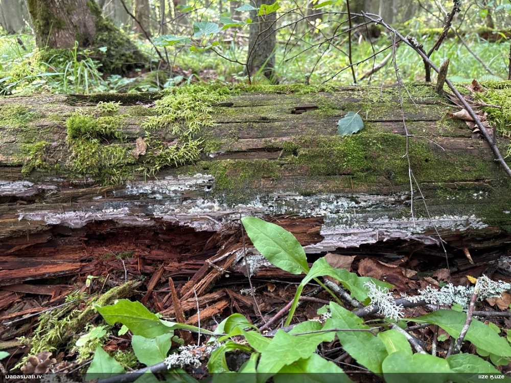 Satrūdējusi kritala mežā, nav dēļi. Iespējams, egle, jauktu koku mežs.