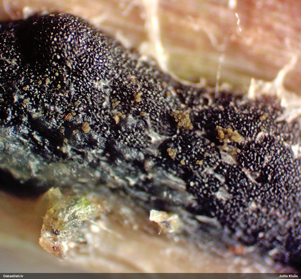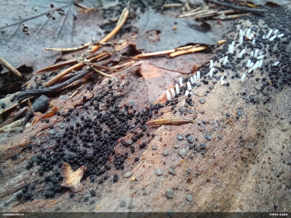 Paldies par paraugu! Paraugā augļķermeņi gan bija ļoti cieti, līdz galam nenobrieduši. Jauna eksemplāra krāsa var būt nozīmīga noteikšanā, bet svarīgi arī nobriedināt (turot mitrākā vietā), citādi perīdiju noņemt mikroskopēšanai ir praktiski neiespējami. Šajā gadījumā mazu gabaliņu izdevās atmiekšķēt un nodabūt, kas sarežģītākos gadījumos varētu būt nepietiekami. Pēc izmēra un perīdija pazīmēm te varētu būt divi varianti L.irregularis un L.epidendrum, kas esot viens no grūtāk atšķiramajiem sugu pāriem. L.epidendrum vairāk raksturīgi, kā es tos saucu, pārstaipi uz augļķermeņa virsmas, kas te ir ļoti labi redzami, tāpēc izšķīros par parastāko sugu.