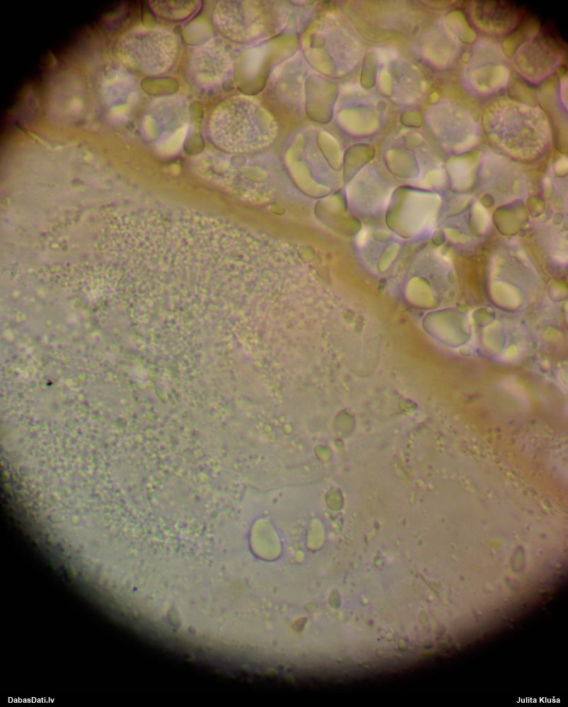 Liels paldies par paraugu! Mikroskopēju, viss kārtībā, kapilīcijs ir un suga pareiza. :) Un kā jau ir gadījies - tikko saņemu un apskatu paraugu, tā uzreiz ekspedīcijā izdodas atrast arī pašai (1 gab. augļķermeni :D). Ir pilnīgi droši, Raivo, bez Tava atraduma es arī nebūtu atradusi, jo uzmanību pievērsu, ka egle bija tieši tāda pati - slīpa un melna, tāpēc īpašs paldies par biotopa un substrāta bildēm! Kad ieraudzīju koka atbilstību, tad meklēju, kamēr atradu. :)