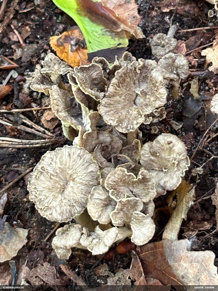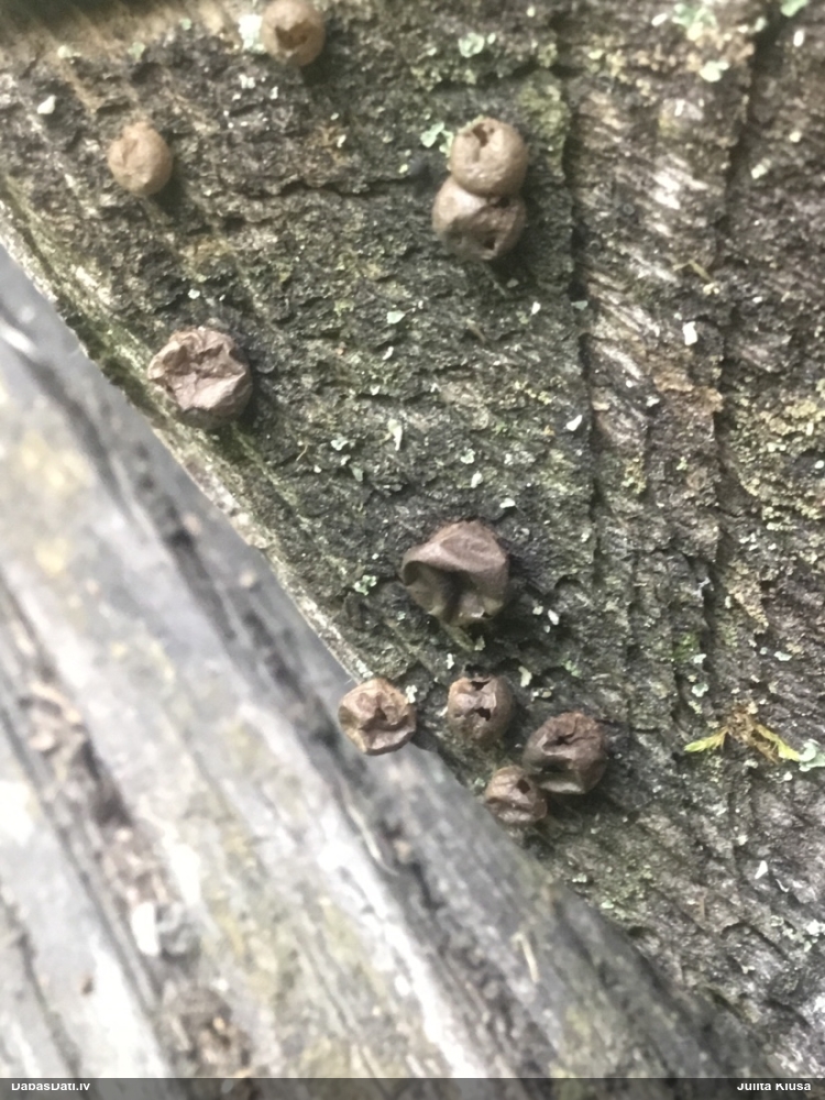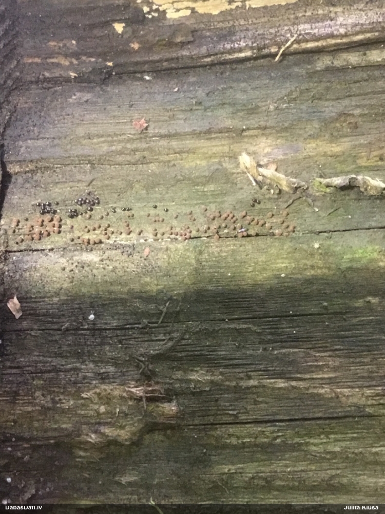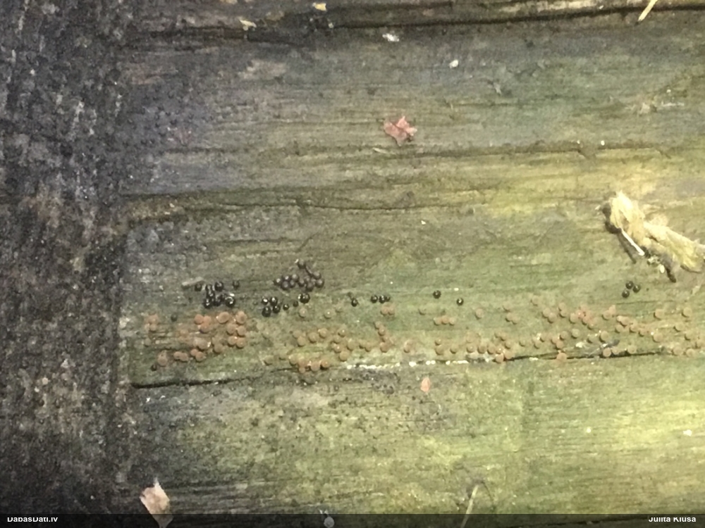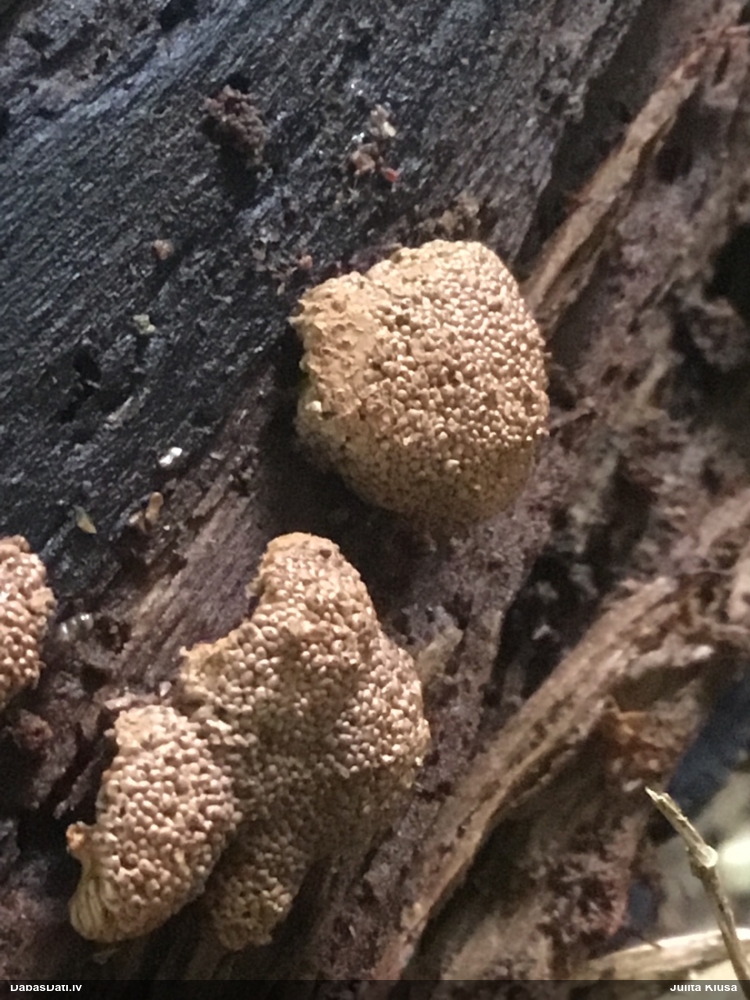 Paldies par paraugu! Paraugā augļķermeņi gan bija ļoti cieti, līdz galam nenobrieduši. Jauna eksemplāra krāsa var būt nozīmīga noteikšanā, bet svarīgi arī nobriedināt (turot mitrākā vietā), citādi perīdiju noņemt mikroskopēšanai ir praktiski neiespējami. Šajā gadījumā mazu gabaliņu izdevās atmiekšķēt un nodabūt, kas sarežģītākos gadījumos varētu būt nepietiekami. Pēc izmēra un perīdija pazīmēm te varētu būt divi varianti L.irregularis un L.epidendrum, kas esot viens no grūtāk atšķiramajiem sugu pāriem. L.epidendrum vairāk raksturīgi, kā es tos saucu, pārstaipi uz augļķermeņa virsmas, kas te ir ļoti labi redzami, tāpēc izšķīros par parastāko sugu.