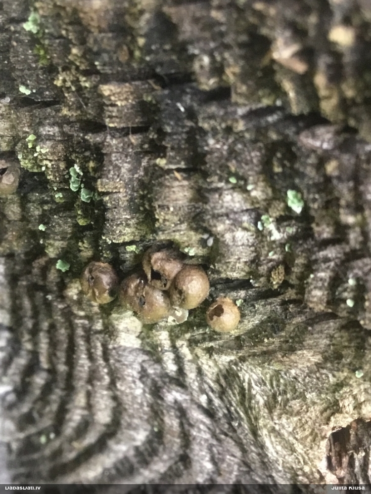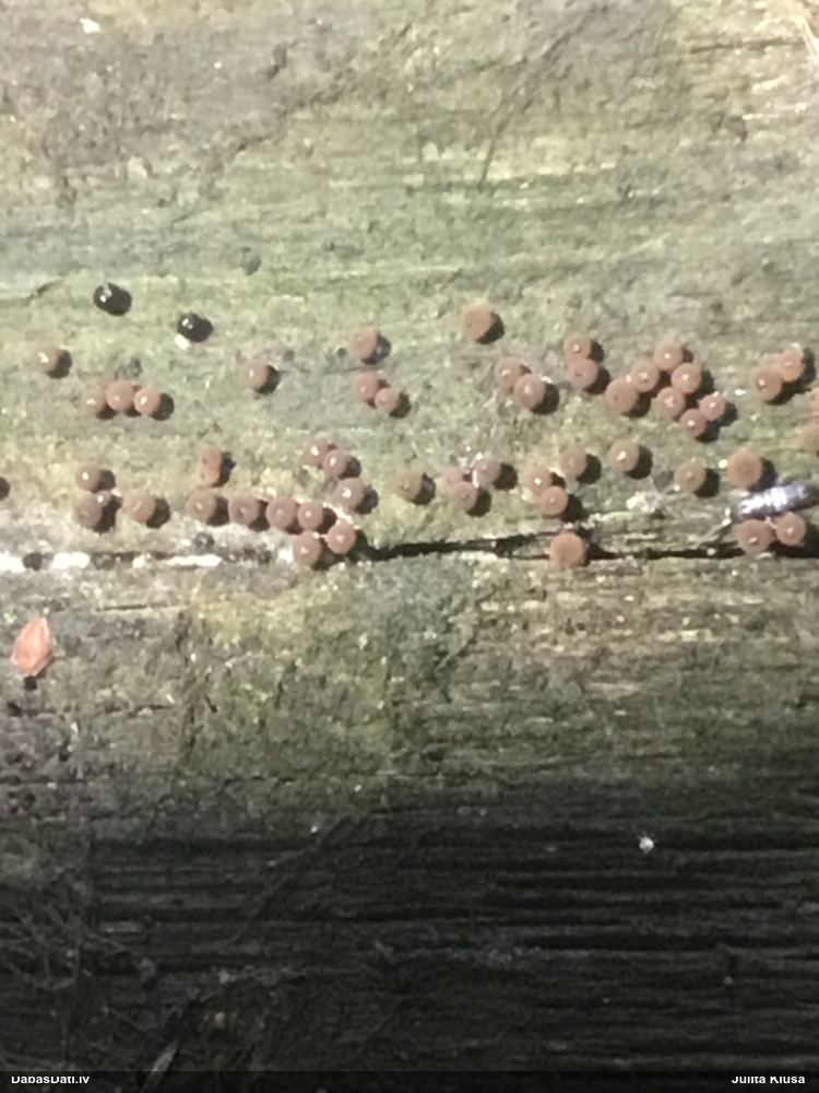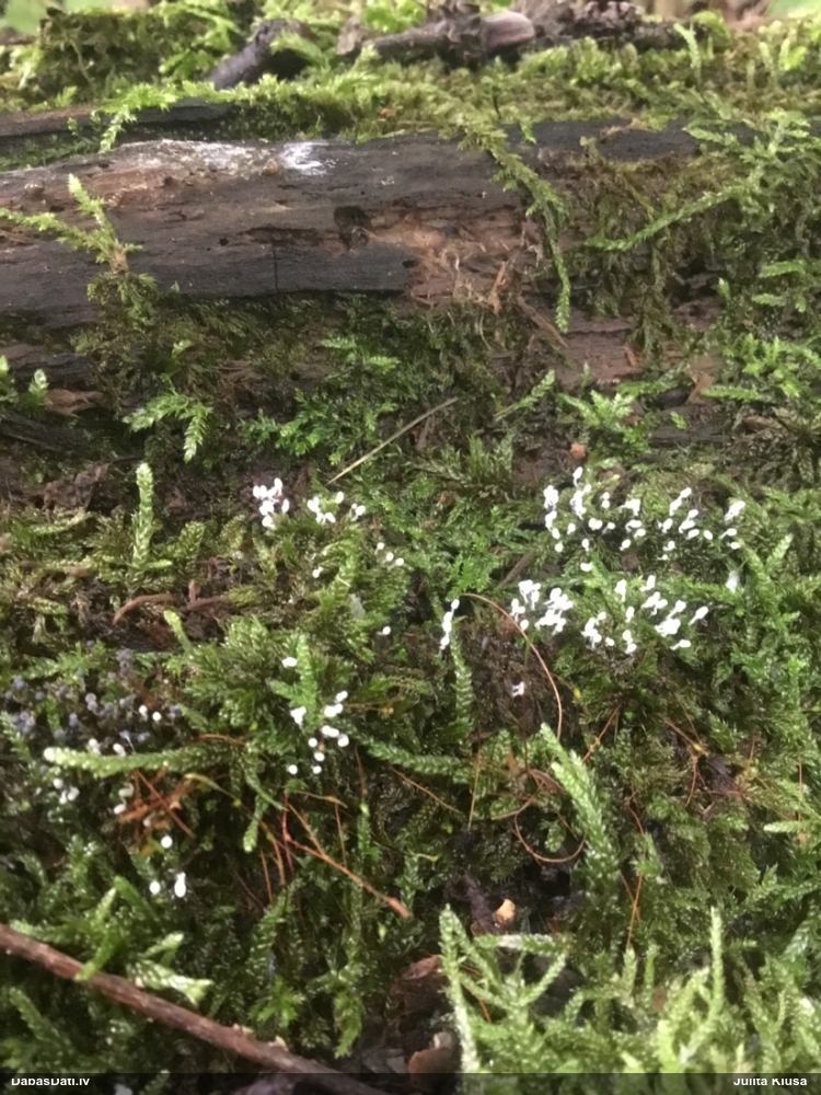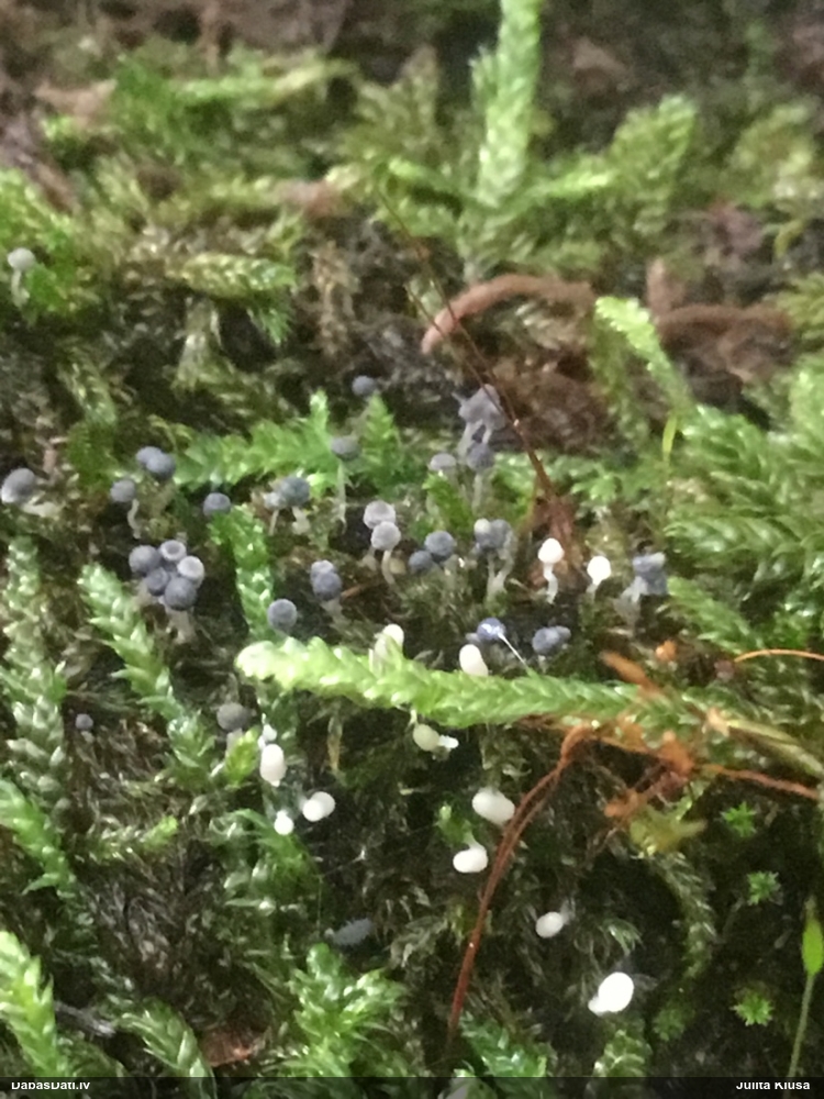 Paldies, Raivo! Ar acu gaišumu man arvien sliktāk, bet mikroskops palīdz. Jā, gribēju teikt, ka paraugam, ja vien nav kāda jutīga atradne, kurai drīkst ievākt tikai mazu gabaliņu, vērts ievākt lielāku gabalu, jo gļotsēnēm patīk kompānija. Un mikroskopa mazajos palielinājumos ar sānu papildus apgaismojumu ir vērts rūpīgi "izstaigāt" visu paraugu. Arī ķērpjus un interesantas sīksēnītes tā var atrast, ko dabā nepamanītu. Ar kriksītēm ir dažādi - pirmās es tā arī tikai citu sugu paraugos pamanīju, bet vēlāk redzēju arī dabā kriskīšu plantācijas - ja to ir daudz, tad var pamanīt jau dabā. Uz sūnām gan ir ekstrēms gadījums, dabā droši nepamanītu, arī eksemplāra noņemšana no sūnas nebija pārāk veiksmīga, tāpēc par noteikšanu mazliet šaubos (sporām mazliet cits tonis). Bet pagaidām citas hipotēzes nav (un konkrētā eksemplāra arī vairs ne).