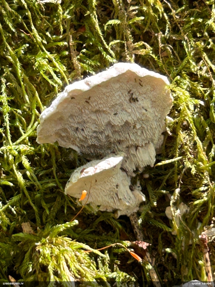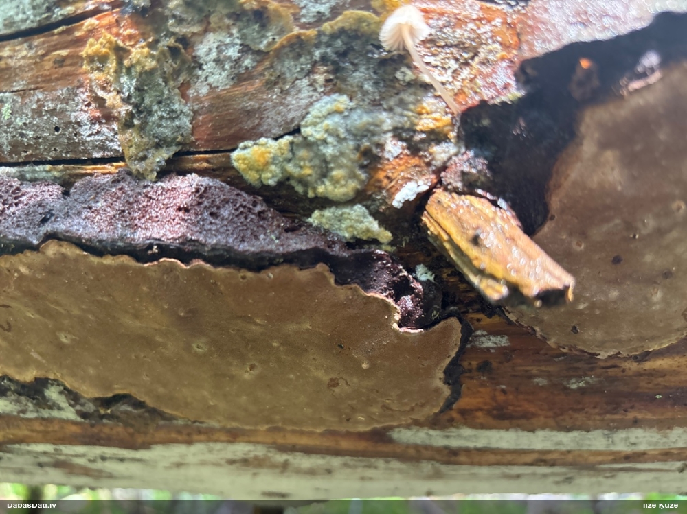 Paldies par paraugu! Paraugā augļķermeņi gan bija ļoti cieti, līdz galam nenobrieduši. Jauna eksemplāra krāsa var būt nozīmīga noteikšanā, bet svarīgi arī nobriedināt (turot mitrākā vietā), citādi perīdiju noņemt mikroskopēšanai ir praktiski neiespējami. Šajā gadījumā mazu gabaliņu izdevās atmiekšķēt un nodabūt, kas sarežģītākos gadījumos varētu būt nepietiekami. Pēc izmēra un perīdija pazīmēm te varētu būt divi varianti L.irregularis un L.epidendrum, kas esot viens no grūtāk atšķiramajiem sugu pāriem. L.epidendrum vairāk raksturīgi, kā es tos saucu, pārstaipi uz augļķermeņa virsmas, kas te ir ļoti labi redzami, tāpēc izšķīros par parastāko sugu.