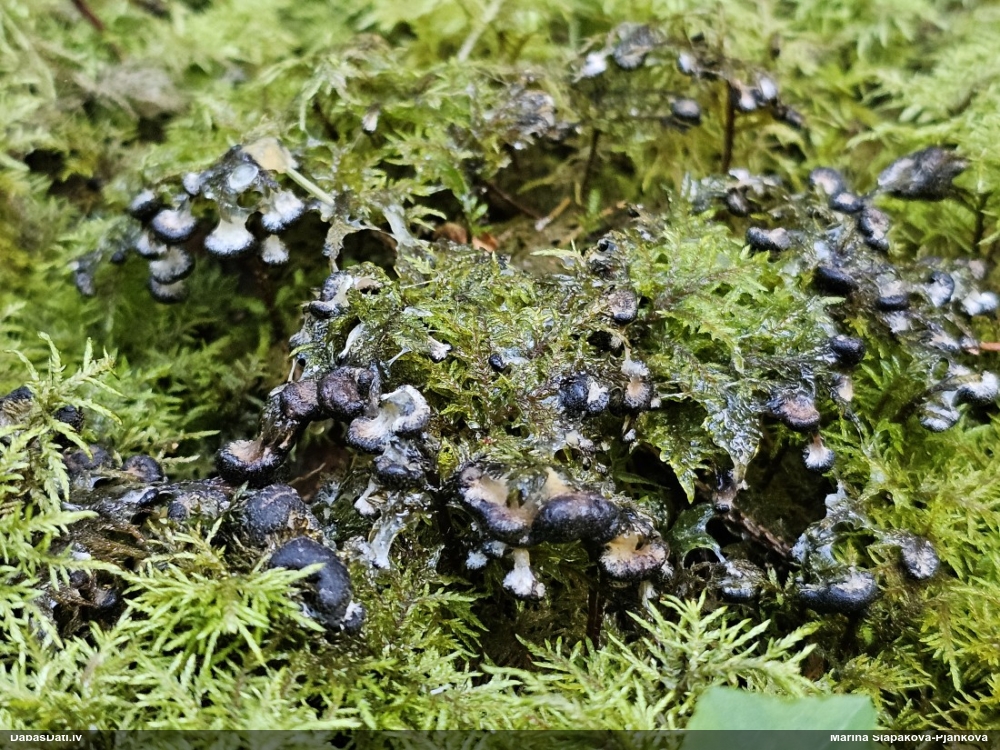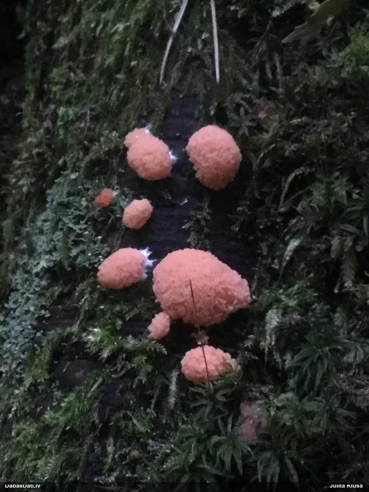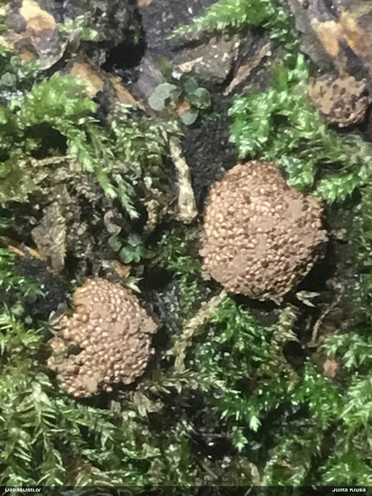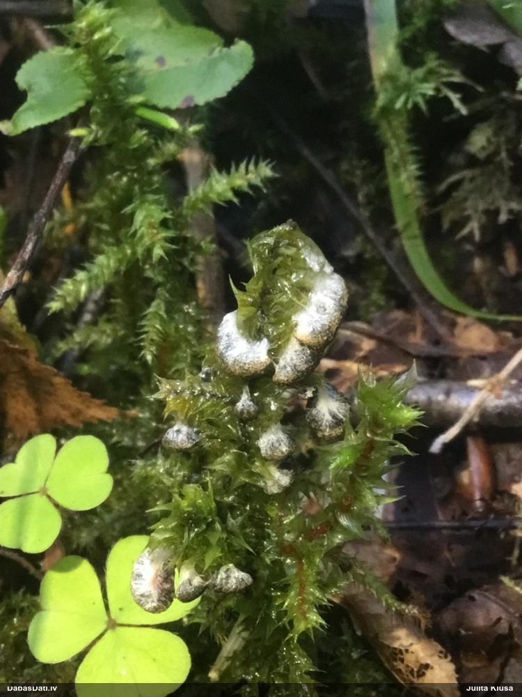 Paldies, Raivo! Ar acu gaišumu man arvien sliktāk, bet mikroskops palīdz. Jā, gribēju teikt, ka paraugam, ja vien nav kāda jutīga atradne, kurai drīkst ievākt tikai mazu gabaliņu, vērts ievākt lielāku gabalu, jo gļotsēnēm patīk kompānija. Un mikroskopa mazajos palielinājumos ar sānu papildus apgaismojumu ir vērts rūpīgi "izstaigāt" visu paraugu. Arī ķērpjus un interesantas sīksēnītes tā var atrast, ko dabā nepamanītu. Ar kriksītēm ir dažādi - pirmās es tā arī tikai citu sugu paraugos pamanīju, bet vēlāk redzēju arī dabā kriskīšu plantācijas - ja to ir daudz, tad var pamanīt jau dabā. Uz sūnām gan ir ekstrēms gadījums, dabā droši nepamanītu, arī eksemplāra noņemšana no sūnas nebija pārāk veiksmīga, tāpēc par noteikšanu mazliet šaubos (sporām mazliet cits tonis). Bet pagaidām citas hipotēzes nav (un konkrētā eksemplāra arī vairs ne).