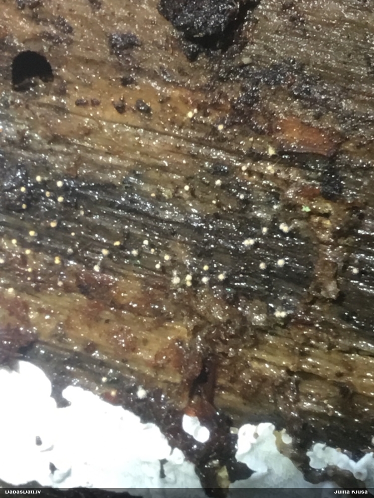 Paldies par paraugu! Paraugā augļķermeņi gan bija ļoti cieti, līdz galam nenobrieduši. Jauna eksemplāra krāsa var būt nozīmīga noteikšanā, bet svarīgi arī nobriedināt (turot mitrākā vietā), citādi perīdiju noņemt mikroskopēšanai ir praktiski neiespējami. Šajā gadījumā mazu gabaliņu izdevās atmiekšķēt un nodabūt, kas sarežģītākos gadījumos varētu būt nepietiekami. Pēc izmēra un perīdija pazīmēm te varētu būt divi varianti L.irregularis un L.epidendrum, kas esot viens no grūtāk atšķiramajiem sugu pāriem. L.epidendrum vairāk raksturīgi, kā es tos saucu, pārstaipi uz augļķermeņa virsmas, kas te ir ļoti labi redzami, tāpēc izšķīros par parastāko sugu.