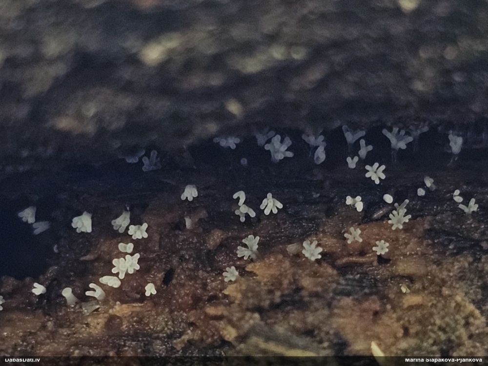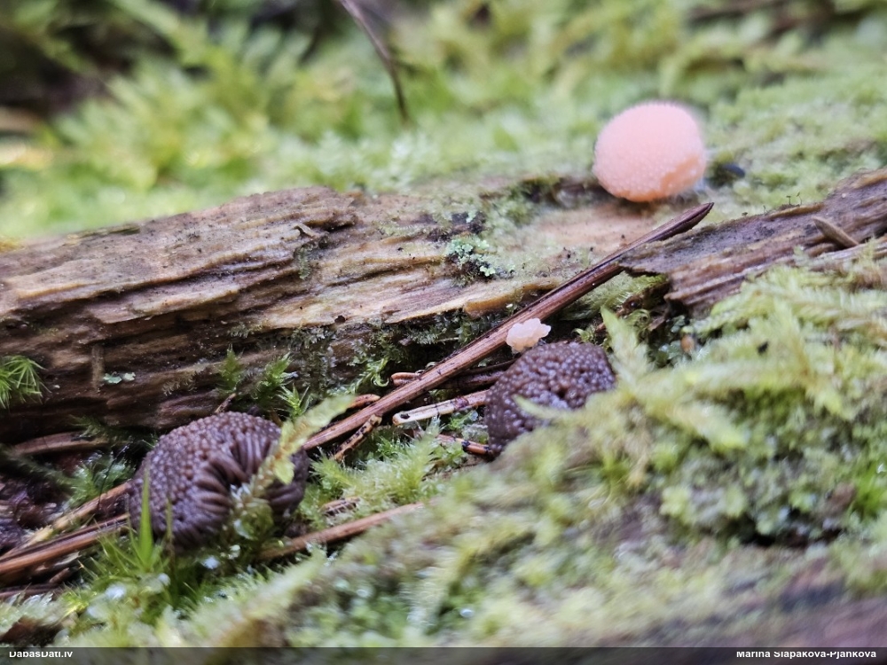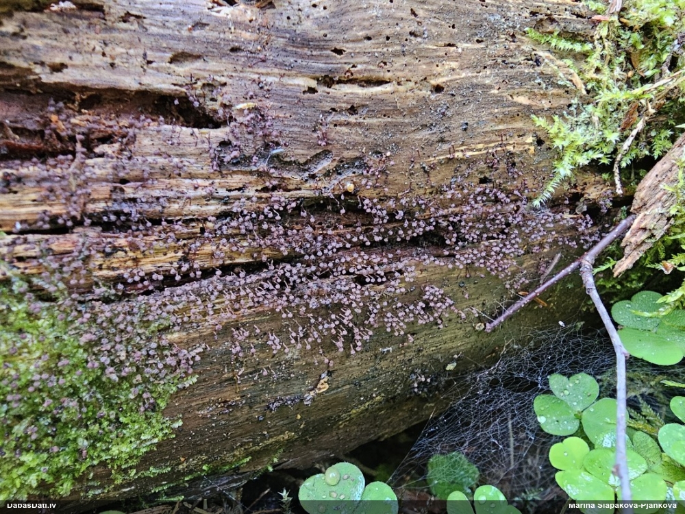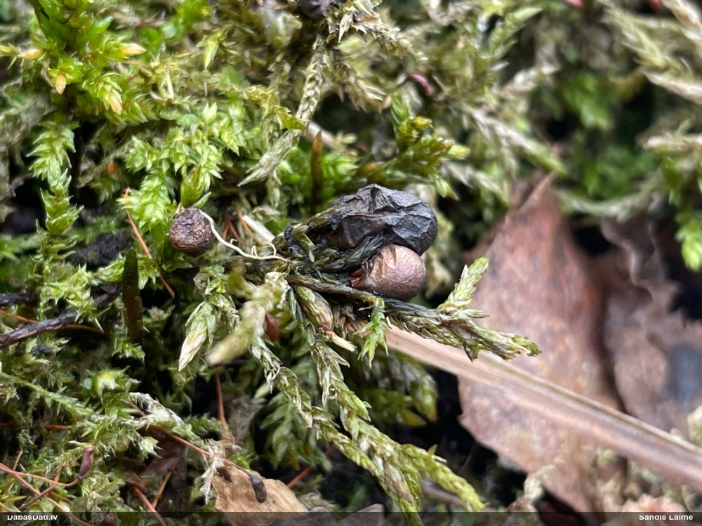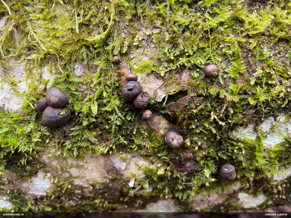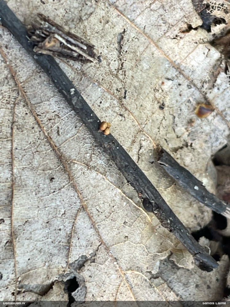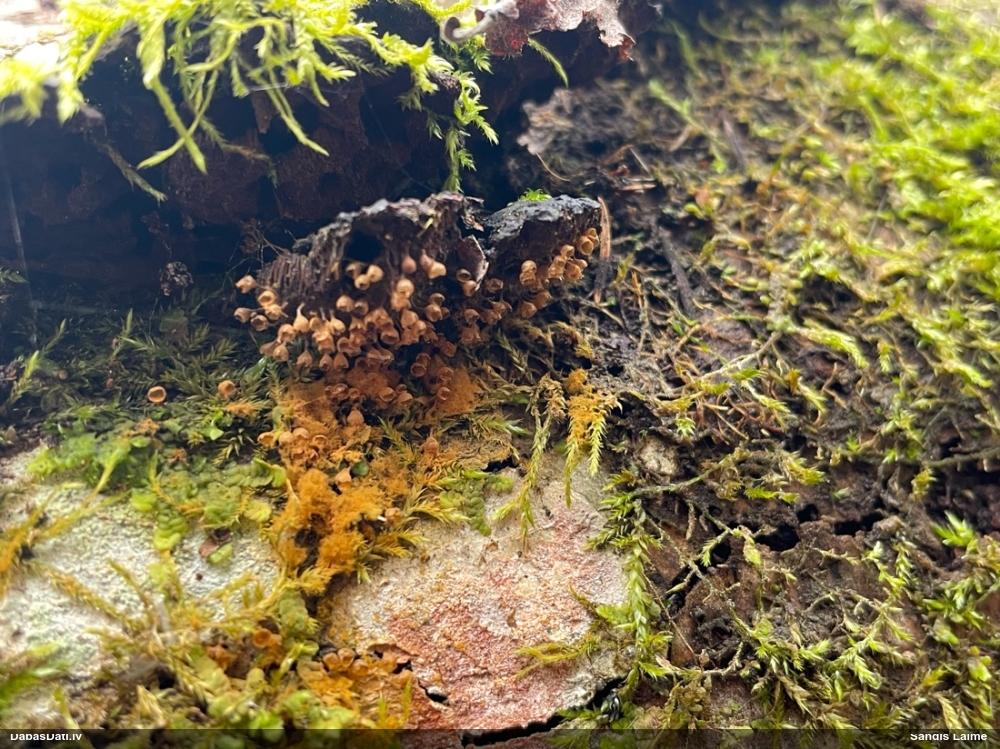 Paldies, Raivo! Ar acu gaišumu man arvien sliktāk, bet mikroskops palīdz. Jā, gribēju teikt, ka paraugam, ja vien nav kāda jutīga atradne, kurai drīkst ievākt tikai mazu gabaliņu, vērts ievākt lielāku gabalu, jo gļotsēnēm patīk kompānija. Un mikroskopa mazajos palielinājumos ar sānu papildus apgaismojumu ir vērts rūpīgi "izstaigāt" visu paraugu. Arī ķērpjus un interesantas sīksēnītes tā var atrast, ko dabā nepamanītu. Ar kriksītēm ir dažādi - pirmās es tā arī tikai citu sugu paraugos pamanīju, bet vēlāk redzēju arī dabā kriskīšu plantācijas - ja to ir daudz, tad var pamanīt jau dabā. Uz sūnām gan ir ekstrēms gadījums, dabā droši nepamanītu, arī eksemplāra noņemšana no sūnas nebija pārāk veiksmīga, tāpēc par noteikšanu mazliet šaubos (sporām mazliet cits tonis). Bet pagaidām citas hipotēzes nav (un konkrētā eksemplāra arī vairs ne).