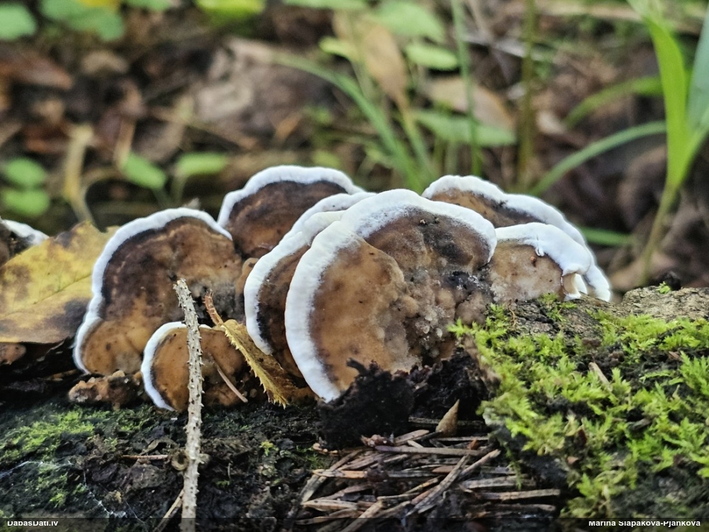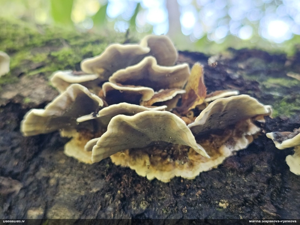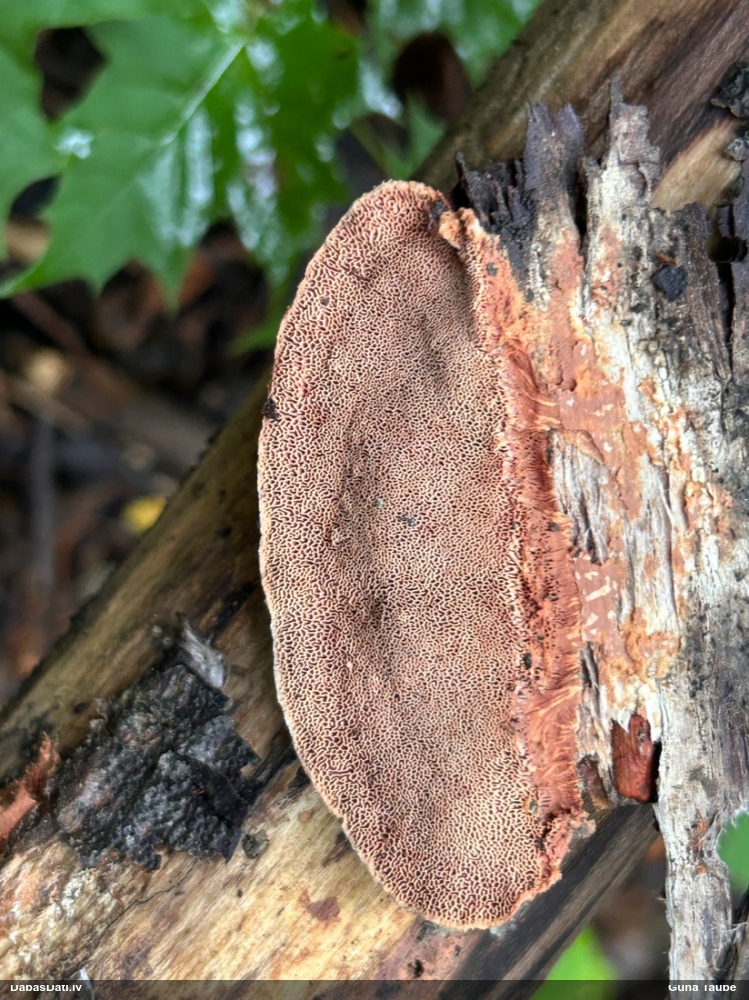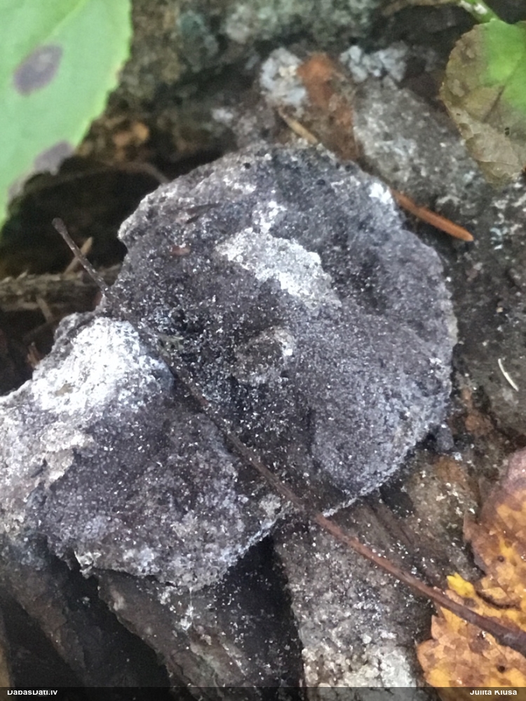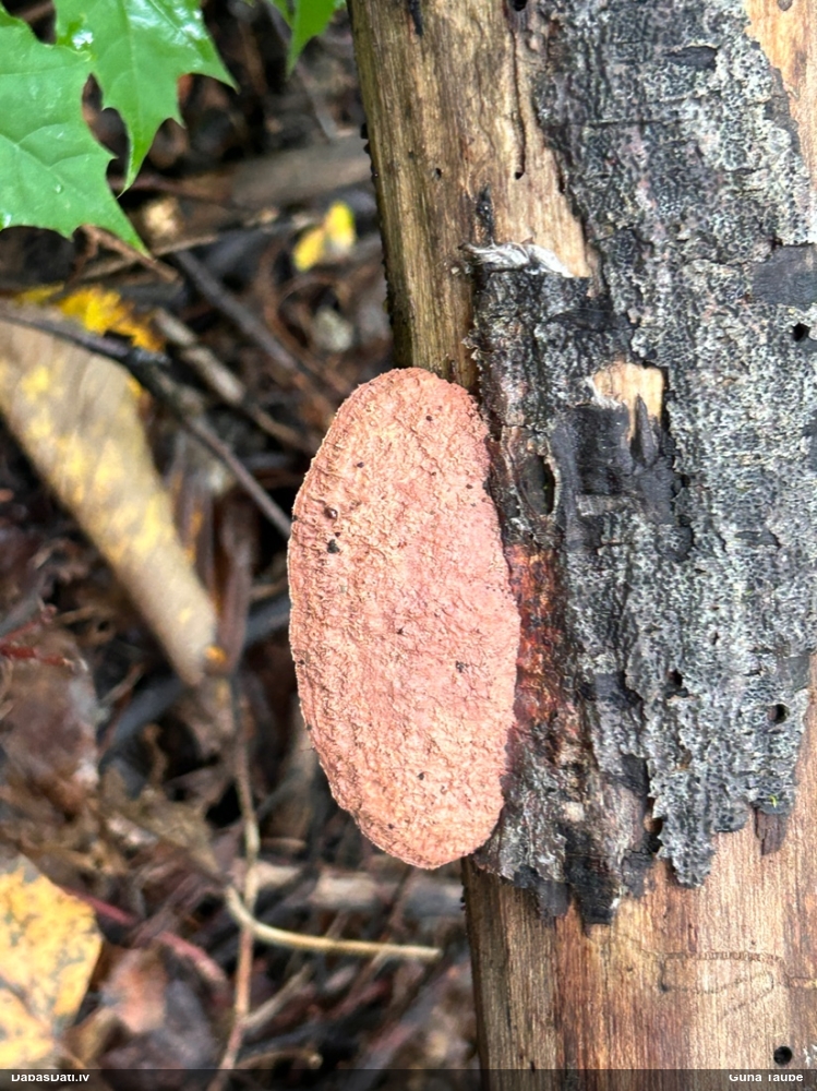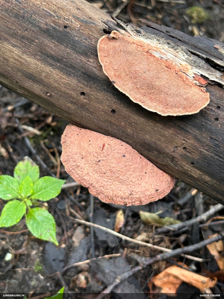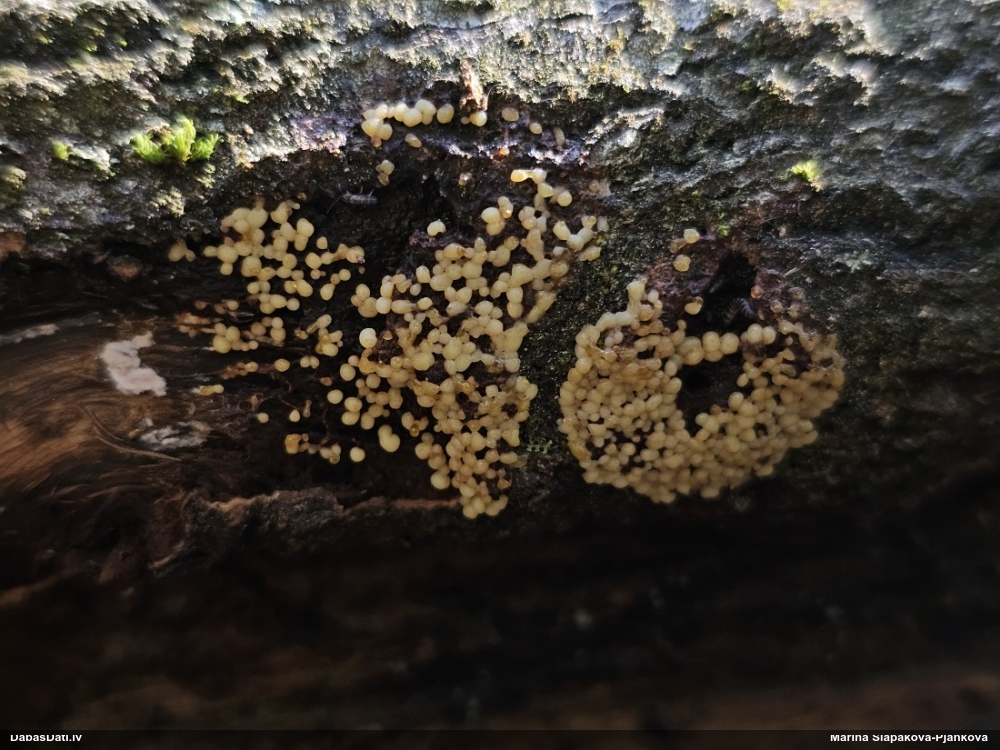 Paldies par paraugu! Paraugā augļķermeņi gan bija ļoti cieti, līdz galam nenobrieduši. Jauna eksemplāra krāsa var būt nozīmīga noteikšanā, bet svarīgi arī nobriedināt (turot mitrākā vietā), citādi perīdiju noņemt mikroskopēšanai ir praktiski neiespējami. Šajā gadījumā mazu gabaliņu izdevās atmiekšķēt un nodabūt, kas sarežģītākos gadījumos varētu būt nepietiekami. Pēc izmēra un perīdija pazīmēm te varētu būt divi varianti L.irregularis un L.epidendrum, kas esot viens no grūtāk atšķiramajiem sugu pāriem. L.epidendrum vairāk raksturīgi, kā es tos saucu, pārstaipi uz augļķermeņa virsmas, kas te ir ļoti labi redzami, tāpēc izšķīros par parastāko sugu.