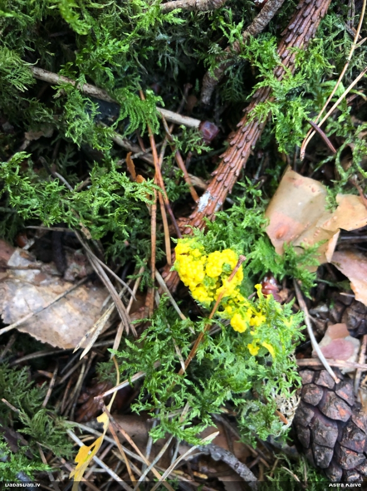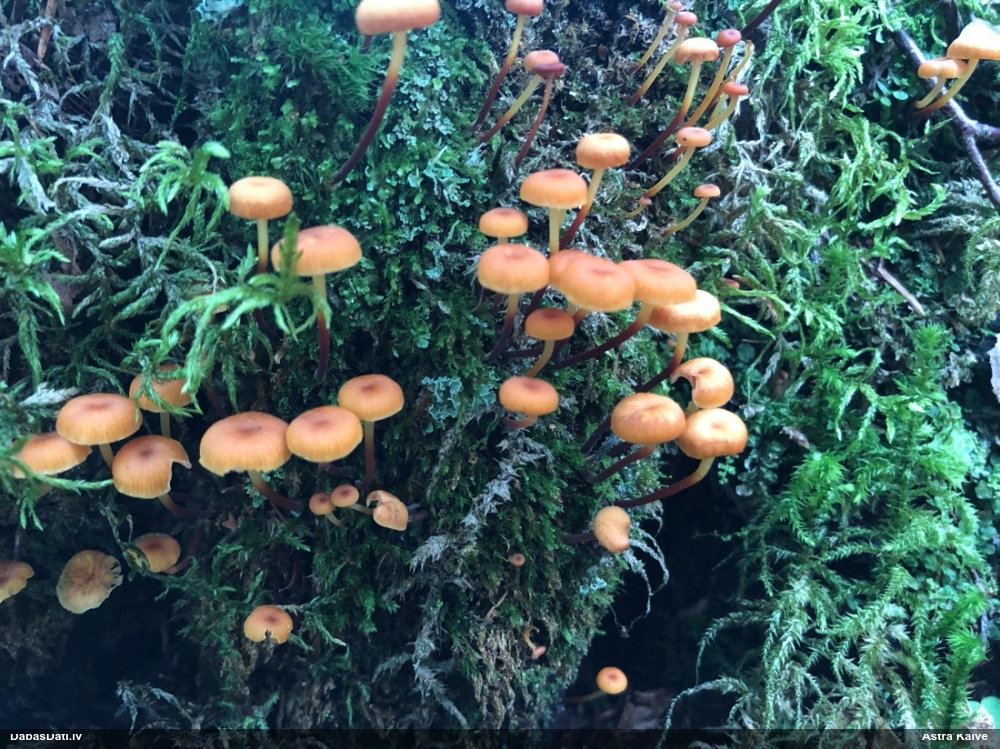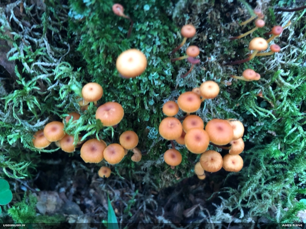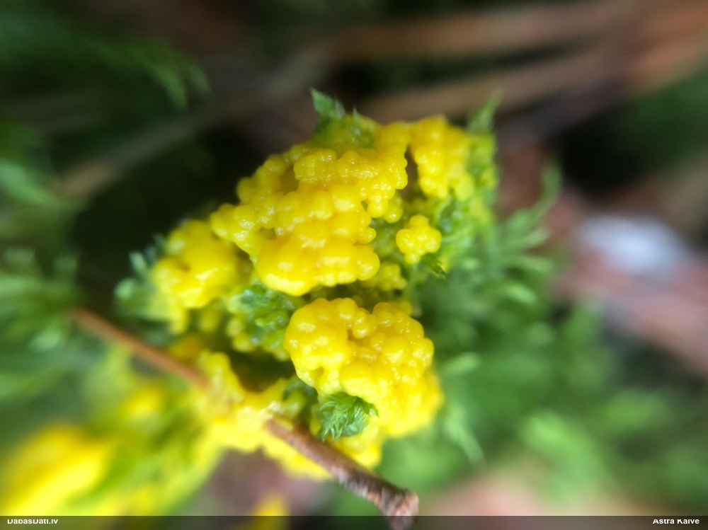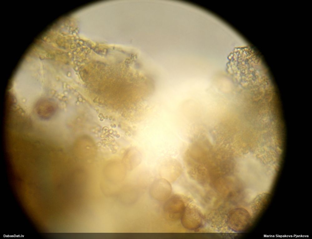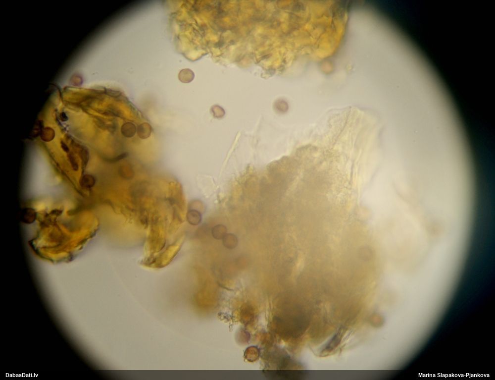 Paldies, Raivo! Ar acu gaišumu man arvien sliktāk, bet mikroskops palīdz. Jā, gribēju teikt, ka paraugam, ja vien nav kāda jutīga atradne, kurai drīkst ievākt tikai mazu gabaliņu, vērts ievākt lielāku gabalu, jo gļotsēnēm patīk kompānija. Un mikroskopa mazajos palielinājumos ar sānu papildus apgaismojumu ir vērts rūpīgi "izstaigāt" visu paraugu. Arī ķērpjus un interesantas sīksēnītes tā var atrast, ko dabā nepamanītu. Ar kriksītēm ir dažādi - pirmās es tā arī tikai citu sugu paraugos pamanīju, bet vēlāk redzēju arī dabā kriskīšu plantācijas - ja to ir daudz, tad var pamanīt jau dabā. Uz sūnām gan ir ekstrēms gadījums, dabā droši nepamanītu, arī eksemplāra noņemšana no sūnas nebija pārāk veiksmīga, tāpēc par noteikšanu mazliet šaubos (sporām mazliet cits tonis). Bet pagaidām citas hipotēzes nav (un konkrētā eksemplāra arī vairs ne).