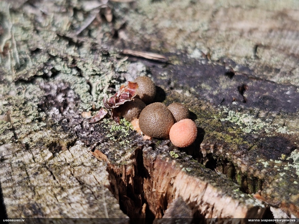 Paldies par paraugu! Paraugā augļķermeņi gan bija ļoti cieti, līdz galam nenobrieduši. Jauna eksemplāra krāsa var būt nozīmīga noteikšanā, bet svarīgi arī nobriedināt (turot mitrākā vietā), citādi perīdiju noņemt mikroskopēšanai ir praktiski neiespējami. Šajā gadījumā mazu gabaliņu izdevās atmiekšķēt un nodabūt, kas sarežģītākos gadījumos varētu būt nepietiekami. Pēc izmēra un perīdija pazīmēm te varētu būt divi varianti L.irregularis un L.epidendrum, kas esot viens no grūtāk atšķiramajiem sugu pāriem. L.epidendrum vairāk raksturīgi, kā es tos saucu, pārstaipi uz augļķermeņa virsmas, kas te ir ļoti labi redzami, tāpēc izšķīros par parastāko sugu.