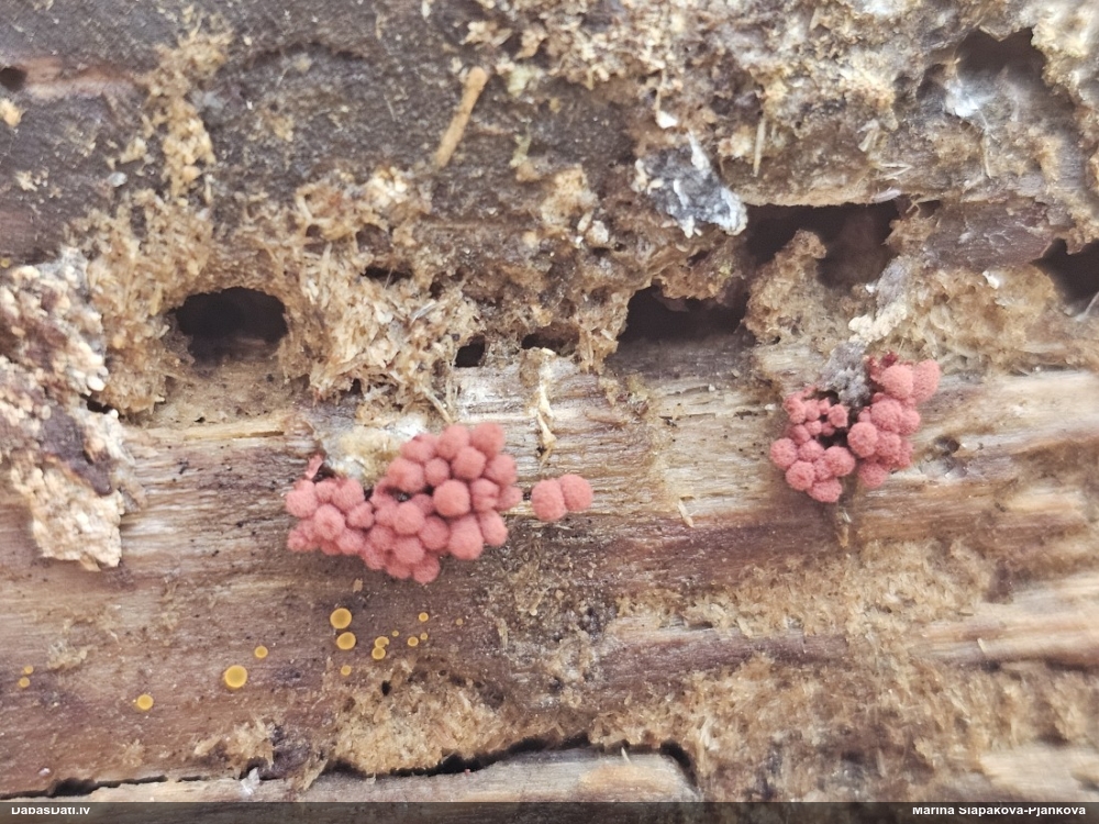 Paldies, Raivo! Ar acu gaišumu man arvien sliktāk, bet mikroskops palīdz. Jā, gribēju teikt, ka paraugam, ja vien nav kāda jutīga atradne, kurai drīkst ievākt tikai mazu gabaliņu, vērts ievākt lielāku gabalu, jo gļotsēnēm patīk kompānija. Un mikroskopa mazajos palielinājumos ar sānu papildus apgaismojumu ir vērts rūpīgi "izstaigāt" visu paraugu. Arī ķērpjus un interesantas sīksēnītes tā var atrast, ko dabā nepamanītu. Ar kriksītēm ir dažādi - pirmās es tā arī tikai citu sugu paraugos pamanīju, bet vēlāk redzēju arī dabā kriskīšu plantācijas - ja to ir daudz, tad var pamanīt jau dabā. Uz sūnām gan ir ekstrēms gadījums, dabā droši nepamanītu, arī eksemplāra noņemšana no sūnas nebija pārāk veiksmīga, tāpēc par noteikšanu mazliet šaubos (sporām mazliet cits tonis). Bet pagaidām citas hipotēzes nav (un konkrētā eksemplāra arī vairs ne).