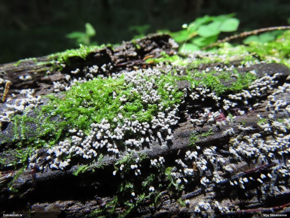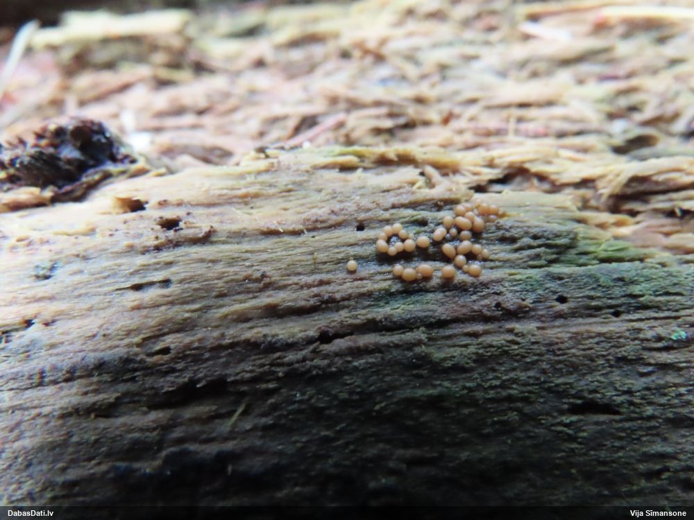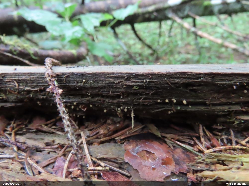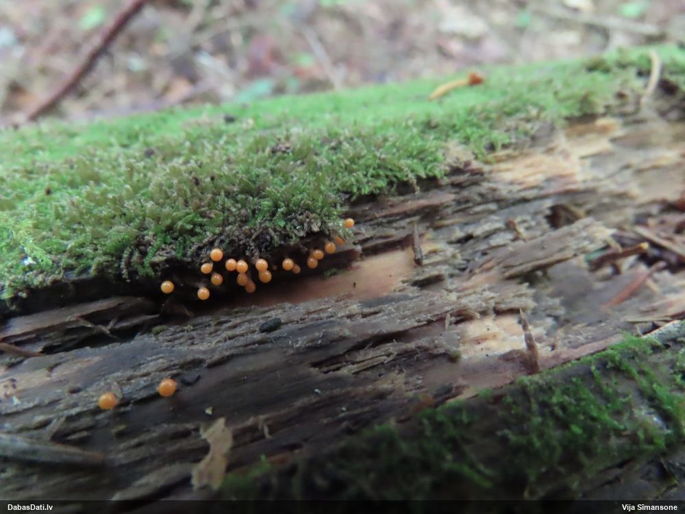 Paldies, Raivo! Ar acu gaišumu man arvien sliktāk, bet mikroskops palīdz. Jā, gribēju teikt, ka paraugam, ja vien nav kāda jutīga atradne, kurai drīkst ievākt tikai mazu gabaliņu, vērts ievākt lielāku gabalu, jo gļotsēnēm patīk kompānija. Un mikroskopa mazajos palielinājumos ar sānu papildus apgaismojumu ir vērts rūpīgi "izstaigāt" visu paraugu. Arī ķērpjus un interesantas sīksēnītes tā var atrast, ko dabā nepamanītu. Ar kriksītēm ir dažādi - pirmās es tā arī tikai citu sugu paraugos pamanīju, bet vēlāk redzēju arī dabā kriskīšu plantācijas - ja to ir daudz, tad var pamanīt jau dabā. Uz sūnām gan ir ekstrēms gadījums, dabā droši nepamanītu, arī eksemplāra noņemšana no sūnas nebija pārāk veiksmīga, tāpēc par noteikšanu mazliet šaubos (sporām mazliet cits tonis). Bet pagaidām citas hipotēzes nav (un konkrētā eksemplāra arī vairs ne).
