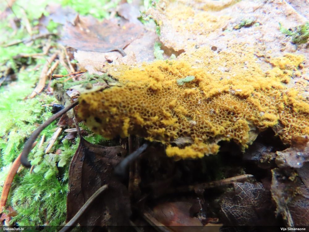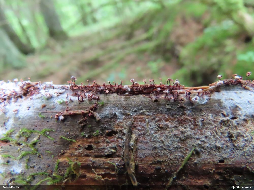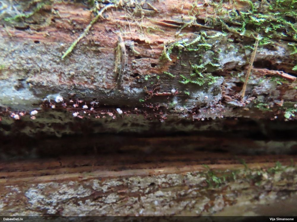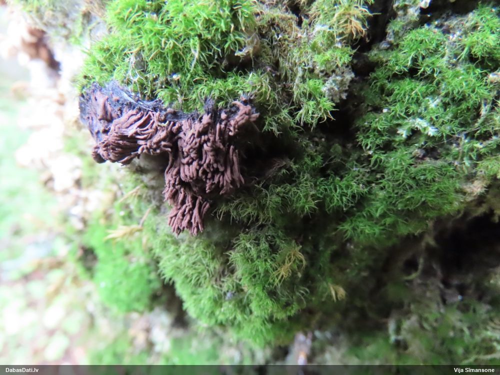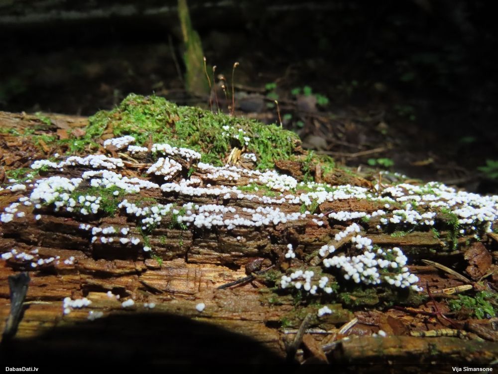 Paldies, Raivo! Ar acu gaišumu man arvien sliktāk, bet mikroskops palīdz. Jā, gribēju teikt, ka paraugam, ja vien nav kāda jutīga atradne, kurai drīkst ievākt tikai mazu gabaliņu, vērts ievākt lielāku gabalu, jo gļotsēnēm patīk kompānija. Un mikroskopa mazajos palielinājumos ar sānu papildus apgaismojumu ir vērts rūpīgi "izstaigāt" visu paraugu. Arī ķērpjus un interesantas sīksēnītes tā var atrast, ko dabā nepamanītu. Ar kriksītēm ir dažādi - pirmās es tā arī tikai citu sugu paraugos pamanīju, bet vēlāk redzēju arī dabā kriskīšu plantācijas - ja to ir daudz, tad var pamanīt jau dabā. Uz sūnām gan ir ekstrēms gadījums, dabā droši nepamanītu, arī eksemplāra noņemšana no sūnas nebija pārāk veiksmīga, tāpēc par noteikšanu mazliet šaubos (sporām mazliet cits tonis). Bet pagaidām citas hipotēzes nav (un konkrētā eksemplāra arī vairs ne).