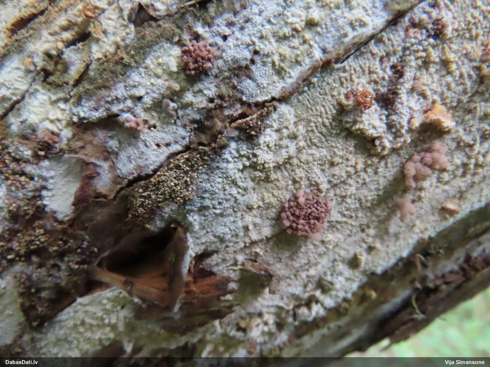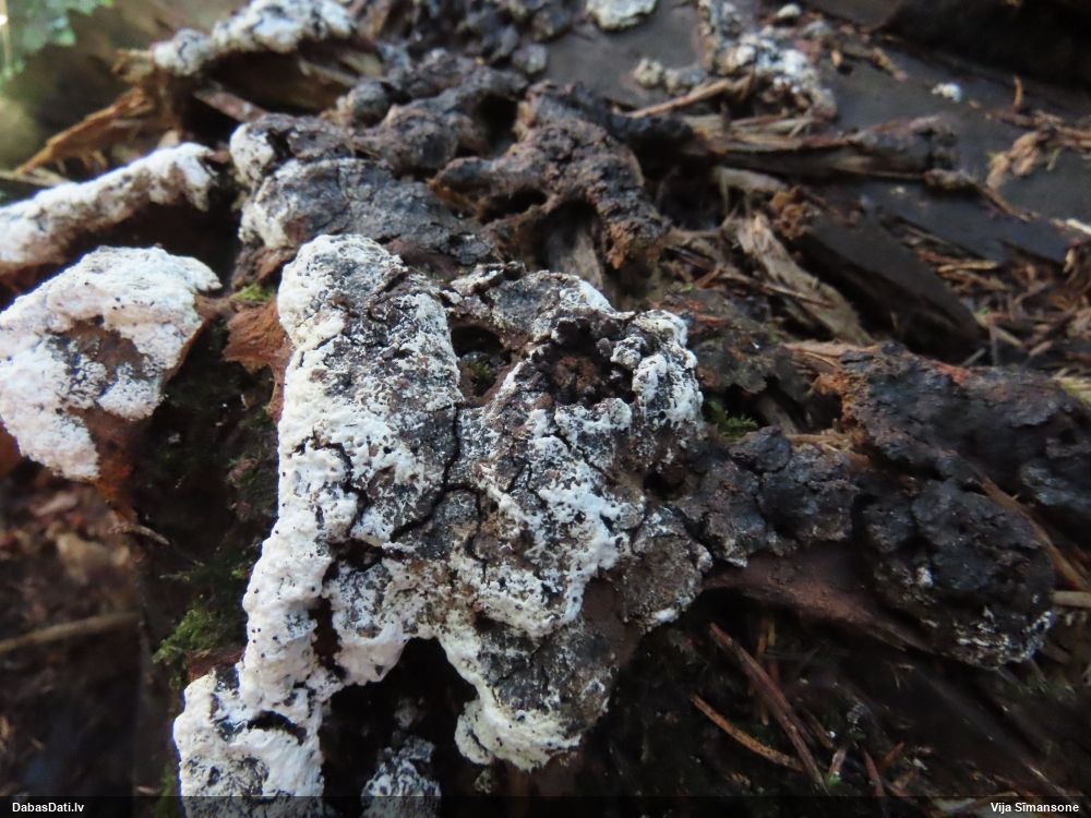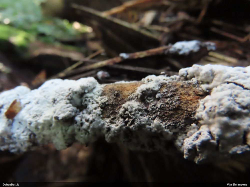 Paldies par paraugu! Paraugā augļķermeņi gan bija ļoti cieti, līdz galam nenobrieduši. Jauna eksemplāra krāsa var būt nozīmīga noteikšanā, bet svarīgi arī nobriedināt (turot mitrākā vietā), citādi perīdiju noņemt mikroskopēšanai ir praktiski neiespējami. Šajā gadījumā mazu gabaliņu izdevās atmiekšķēt un nodabūt, kas sarežģītākos gadījumos varētu būt nepietiekami. Pēc izmēra un perīdija pazīmēm te varētu būt divi varianti L.irregularis un L.epidendrum, kas esot viens no grūtāk atšķiramajiem sugu pāriem. L.epidendrum vairāk raksturīgi, kā es tos saucu, pārstaipi uz augļķermeņa virsmas, kas te ir ļoti labi redzami, tāpēc izšķīros par parastāko sugu.