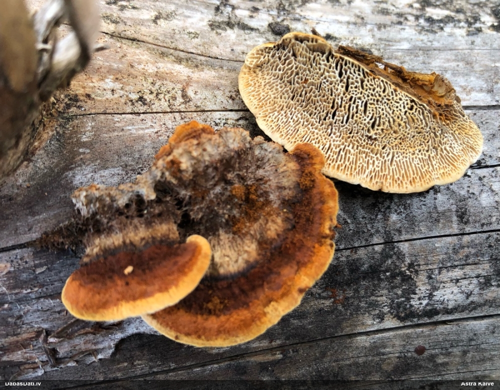 Paldies par paraugu! Paraugā augļķermeņi gan bija ļoti cieti, līdz galam nenobrieduši. Jauna eksemplāra krāsa var būt nozīmīga noteikšanā, bet svarīgi arī nobriedināt (turot mitrākā vietā), citādi perīdiju noņemt mikroskopēšanai ir praktiski neiespējami. Šajā gadījumā mazu gabaliņu izdevās atmiekšķēt un nodabūt, kas sarežģītākos gadījumos varētu būt nepietiekami. Pēc izmēra un perīdija pazīmēm te varētu būt divi varianti L.irregularis un L.epidendrum, kas esot viens no grūtāk atšķiramajiem sugu pāriem. L.epidendrum vairāk raksturīgi, kā es tos saucu, pārstaipi uz augļķermeņa virsmas, kas te ir ļoti labi redzami, tāpēc izšķīros par parastāko sugu.