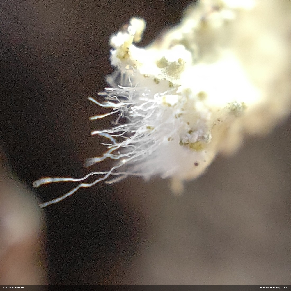 neatceros, kad tik ļoti nevarējusi sagaidīt mikroskopēšanu savam paraugam, kas identisks ar šo novērojumu. Mizaine ir. Vistuvāk no tā, ko paguvu izpētīt, tiešām kārpainā mizaine, bet kapilīcijs, manuprāt, ir mazliet citādāks, nemaz nerunājot par to, ka tā ļoti daudz un pat staipīgs (kārpainajai kapilīcijs maz un nestaipās). Un Neuberta aprakstā tikko iztulkoju par substrātu "Tā substrāts ir gandrīz tikai lapu koku miza, tikai vienā Picea gadījumā, dažreiz arī uz sūnām". Bet mums abām ir pārliecinošas egles un kopīgs izskats, kas atšķiras no kārpainās, nu neticu, ka varētu būt kārpainā. Ticamāk, ka zinātnei jauna suga :D. bet es vēl papētīšu, varbūt kaut kur tomēr ir kas tāds aprakstīts.