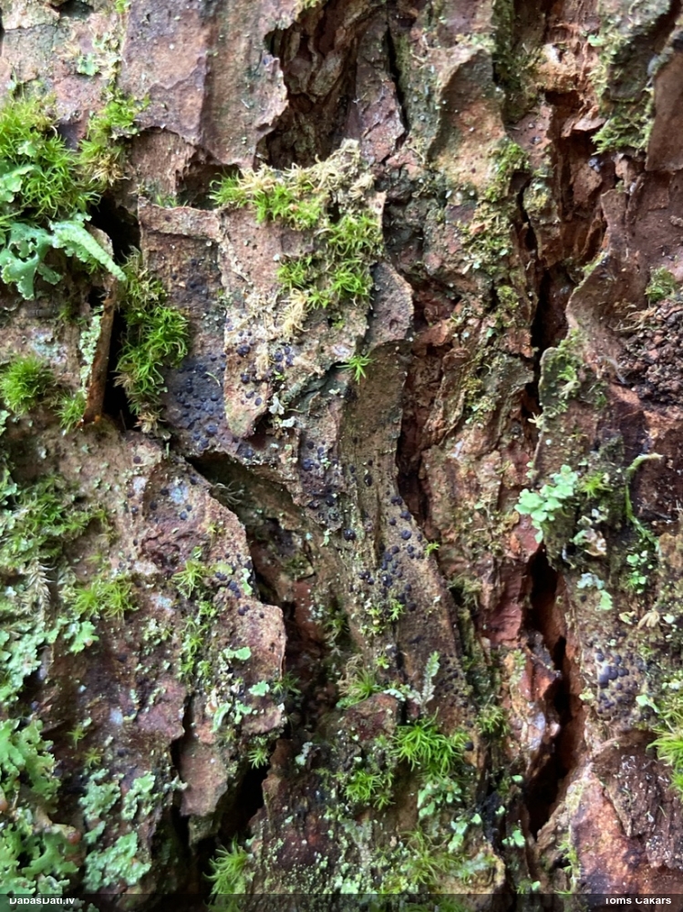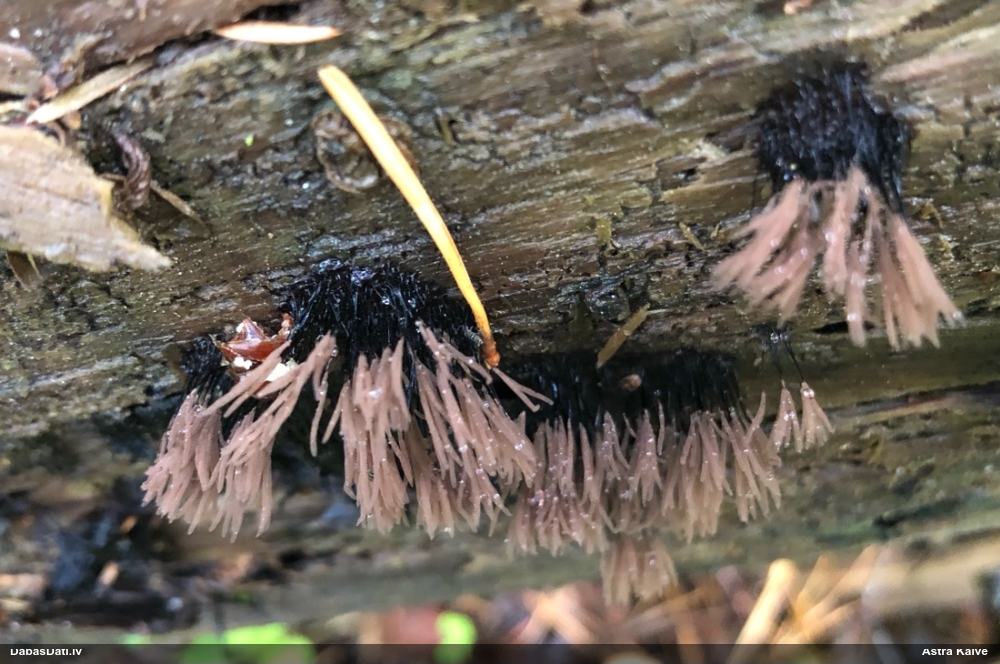 Šis interesants. Uz sausām priedes kritalām rozā mazi līdzīga izskata augļķermeņi maijā aug divām citādi atšķirīgām sugām (dažādās dzimtās) - melnajai plaispikai Amaurochaete atra un trauslajam gļotpūpēdim Reticularia jurana. Pēc sīkām mikropazīmēm (foto nav redzama pat ne sīka balta pakāje ap augļķermeni, un uz virsmas ar lielu piepūli var ja ne saskatīt, tad iztēloties tīklotu virsmas rakstu) izšķīros par biežāko no abām - melno plaispiku, kas tipiski aug samērā atklātās, skrajās vietās, t.sk. nesenos izcirtumos.