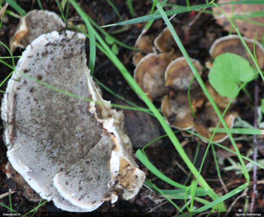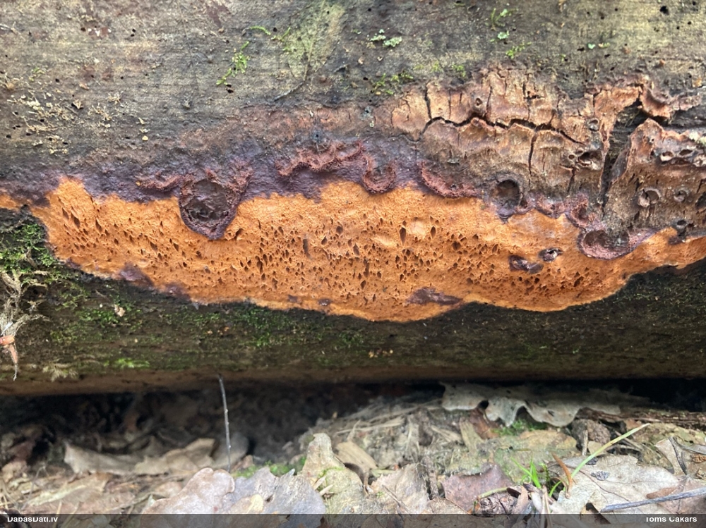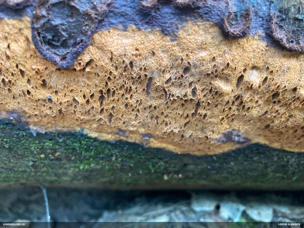 Paldies par paraugu! Paraugā augļķermeņi gan bija ļoti cieti, līdz galam nenobrieduši. Jauna eksemplāra krāsa var būt nozīmīga noteikšanā, bet svarīgi arī nobriedināt (turot mitrākā vietā), citādi perīdiju noņemt mikroskopēšanai ir praktiski neiespējami. Šajā gadījumā mazu gabaliņu izdevās atmiekšķēt un nodabūt, kas sarežģītākos gadījumos varētu būt nepietiekami. Pēc izmēra un perīdija pazīmēm te varētu būt divi varianti L.irregularis un L.epidendrum, kas esot viens no grūtāk atšķiramajiem sugu pāriem. L.epidendrum vairāk raksturīgi, kā es tos saucu, pārstaipi uz augļķermeņa virsmas, kas te ir ļoti labi redzami, tāpēc izšķīros par parastāko sugu.