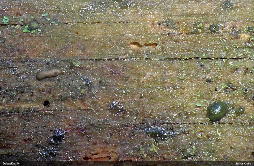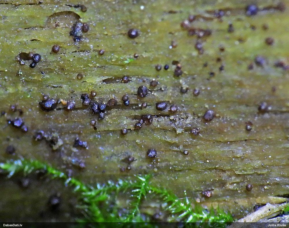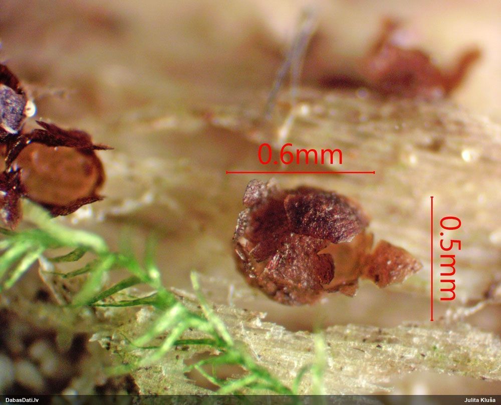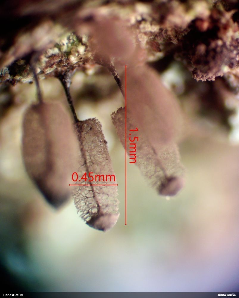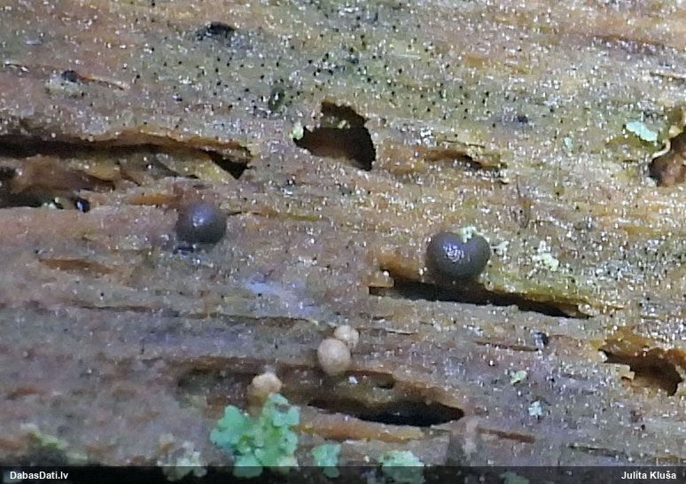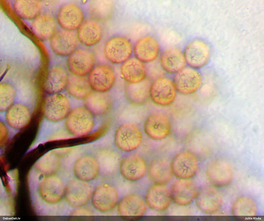 Paldies, Raivo! Ar acu gaišumu man arvien sliktāk, bet mikroskops palīdz. Jā, gribēju teikt, ka paraugam, ja vien nav kāda jutīga atradne, kurai drīkst ievākt tikai mazu gabaliņu, vērts ievākt lielāku gabalu, jo gļotsēnēm patīk kompānija. Un mikroskopa mazajos palielinājumos ar sānu papildus apgaismojumu ir vērts rūpīgi "izstaigāt" visu paraugu. Arī ķērpjus un interesantas sīksēnītes tā var atrast, ko dabā nepamanītu. Ar kriksītēm ir dažādi - pirmās es tā arī tikai citu sugu paraugos pamanīju, bet vēlāk redzēju arī dabā kriskīšu plantācijas - ja to ir daudz, tad var pamanīt jau dabā. Uz sūnām gan ir ekstrēms gadījums, dabā droši nepamanītu, arī eksemplāra noņemšana no sūnas nebija pārāk veiksmīga, tāpēc par noteikšanu mazliet šaubos (sporām mazliet cits tonis). Bet pagaidām citas hipotēzes nav (un konkrētā eksemplāra arī vairs ne).