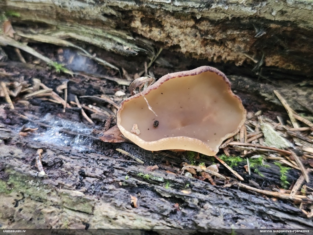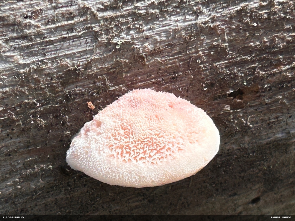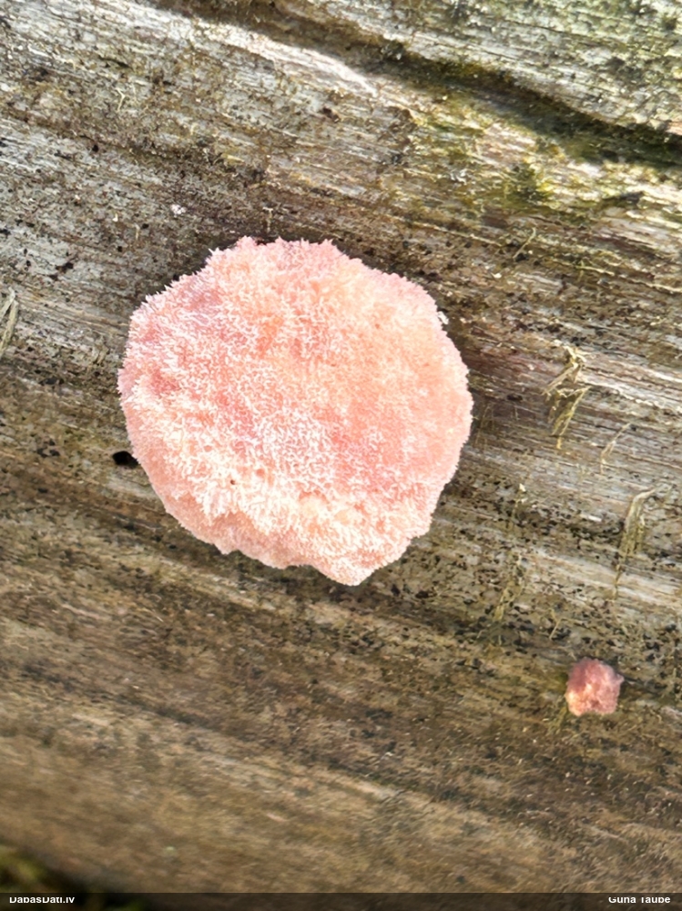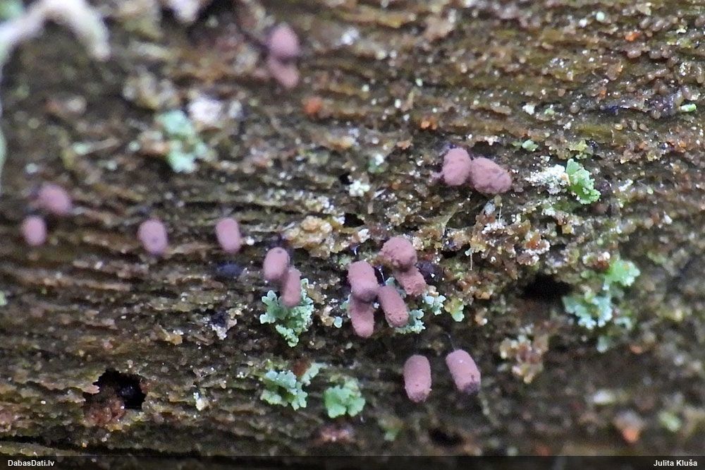 Šis interesants. Uz sausām priedes kritalām rozā mazi līdzīga izskata augļķermeņi maijā aug divām citādi atšķirīgām sugām (dažādās dzimtās) - melnajai plaispikai Amaurochaete atra un trauslajam gļotpūpēdim Reticularia jurana. Pēc sīkām mikropazīmēm (foto nav redzama pat ne sīka balta pakāje ap augļķermeni, un uz virsmas ar lielu piepūli var ja ne saskatīt, tad iztēloties tīklotu virsmas rakstu) izšķīros par biežāko no abām - melno plaispiku, kas tipiski aug samērā atklātās, skrajās vietās, t.sk. nesenos izcirtumos.