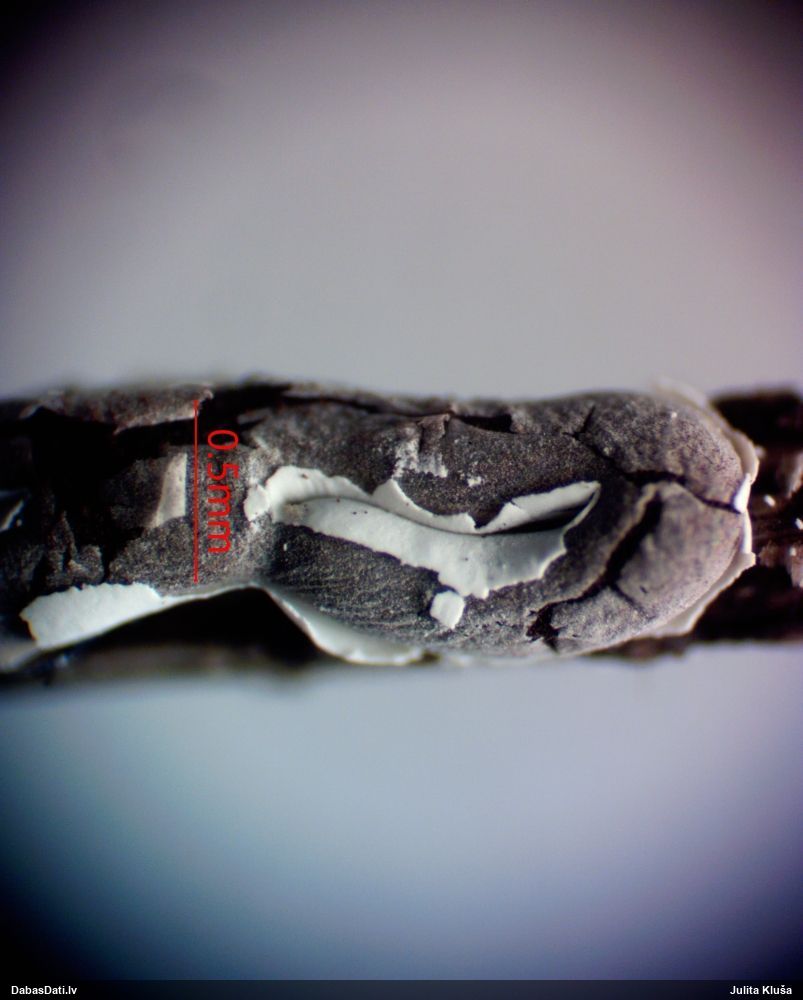 Paldies par paraugu! Paraugā augļķermeņi gan bija ļoti cieti, līdz galam nenobrieduši. Jauna eksemplāra krāsa var būt nozīmīga noteikšanā, bet svarīgi arī nobriedināt (turot mitrākā vietā), citādi perīdiju noņemt mikroskopēšanai ir praktiski neiespējami. Šajā gadījumā mazu gabaliņu izdevās atmiekšķēt un nodabūt, kas sarežģītākos gadījumos varētu būt nepietiekami. Pēc izmēra un perīdija pazīmēm te varētu būt divi varianti L.irregularis un L.epidendrum, kas esot viens no grūtāk atšķiramajiem sugu pāriem. L.epidendrum vairāk raksturīgi, kā es tos saucu, pārstaipi uz augļķermeņa virsmas, kas te ir ļoti labi redzami, tāpēc izšķīros par parastāko sugu.