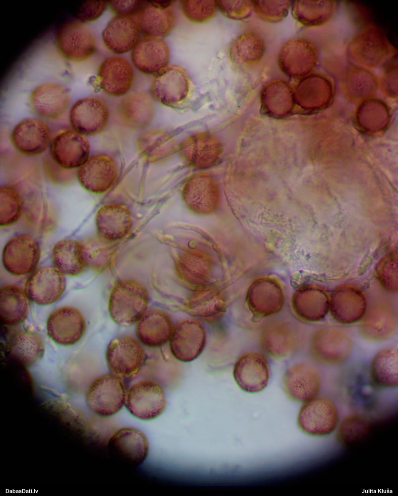 Šīm paraugs nav saglabājies? Nevaru saprast, vai sporas ir ar tīkliņu no adatiņām, vai ar līnijām. Īsti nesanāk neviena man zināma suga.
