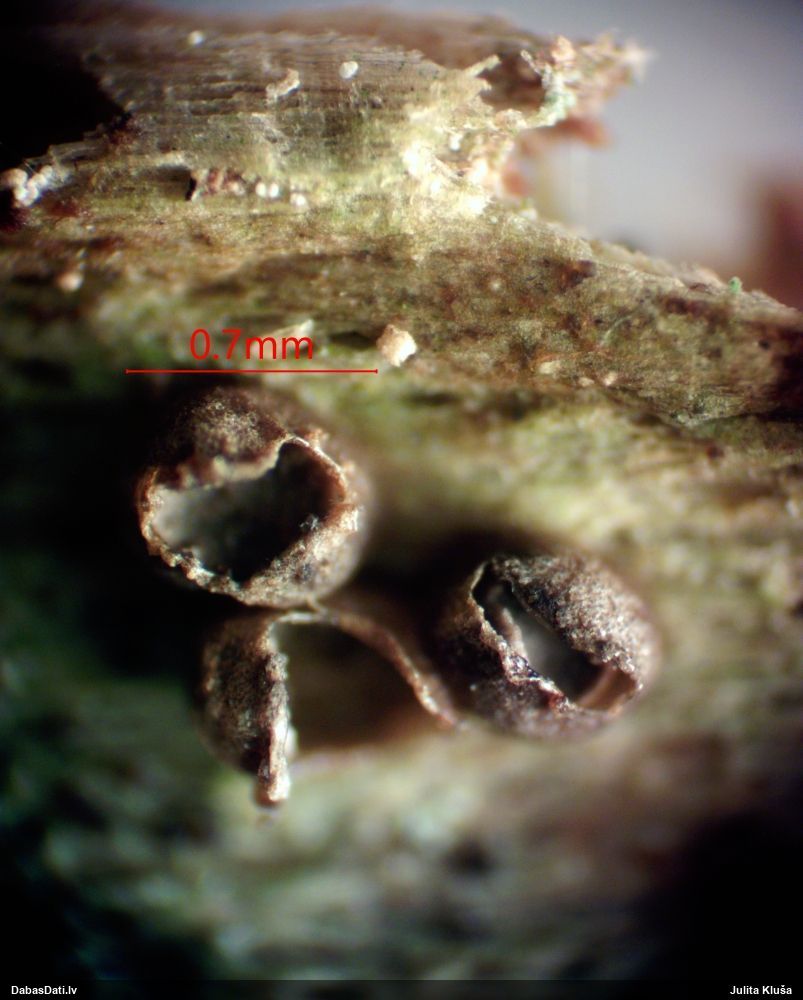 neatceros, kad tik ļoti nevarējusi sagaidīt mikroskopēšanu savam paraugam, kas identisks ar šo novērojumu. Mizaine ir. Vistuvāk no tā, ko paguvu izpētīt, tiešām kārpainā mizaine, bet kapilīcijs, manuprāt, ir mazliet citādāks, nemaz nerunājot par to, ka tā ļoti daudz un pat staipīgs (kārpainajai kapilīcijs maz un nestaipās). Un Neuberta aprakstā tikko iztulkoju par substrātu "Tā substrāts ir gandrīz tikai lapu koku miza, tikai vienā Picea gadījumā, dažreiz arī uz sūnām". Bet mums abām ir pārliecinošas egles un kopīgs izskats, kas atšķiras no kārpainās, nu neticu, ka varētu būt kārpainā. Ticamāk, ka zinātnei jauna suga :D. bet es vēl papētīšu, varbūt kaut kur tomēr ir kas tāds aprakstīts.
